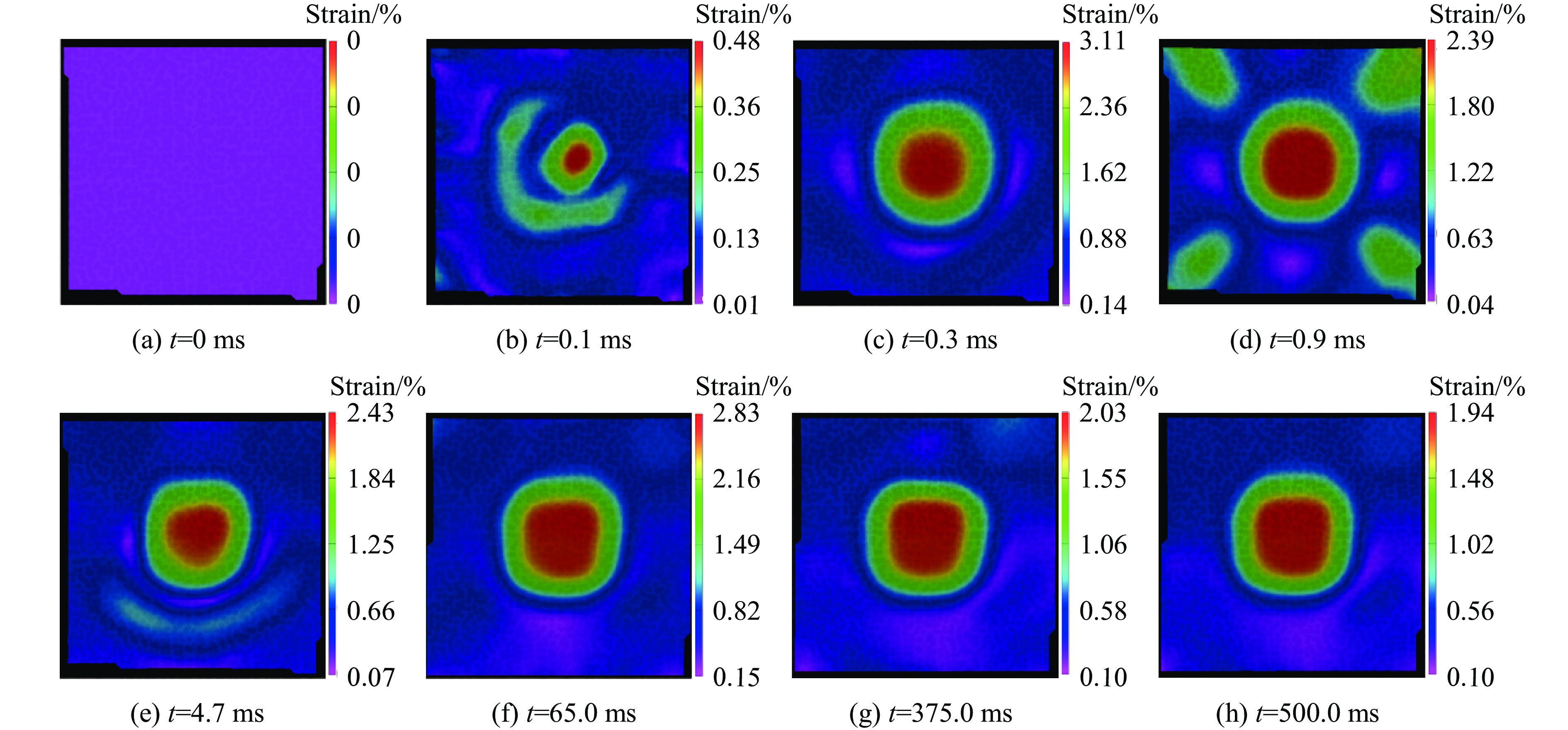 • 为了探究STG填充蜂窝夹芯板在爆炸载荷下的动态响应,通过高速DIC技术,测试并计算了结构背面板的变形历程。图5图6分别显示了TG4背面板的位移场历程和应变场历程。t=0.1 ms时,结构背面板中心区域出现小面积受拉变形,中心点位移增大;t=0.3 ms时,板面中心产生位移和应变的区域扩大,形成了一个应变集中区,而周围区域的应变较低,整体呈现环状应变分布;t=0.9 ms时,板面中心集中变形区域传递到约束边界,4个边角出现拉伸应变,达到背面板的拉伸屈服极限,形成塑性铰;t=4.7 ms时,4个边角的拉应变消失,板面中心外部出现一个明显的月牙形应变区域,显示该区域的应变从中心向外逐渐增大,该月牙形应变区域的形成可能与夹具夹持不均匀有关,导致该区域变形的非对称扩展;t=65.0 ms时,背面板位移达到峰值;t=375.0 ms时,夹芯板回弹至最低点,中心应变区域扩大,应变减小;t=500.0 ms时,位移场和应变场均趋于稳定,最终位移和应变都集中在爆炸冲击的中心区域。