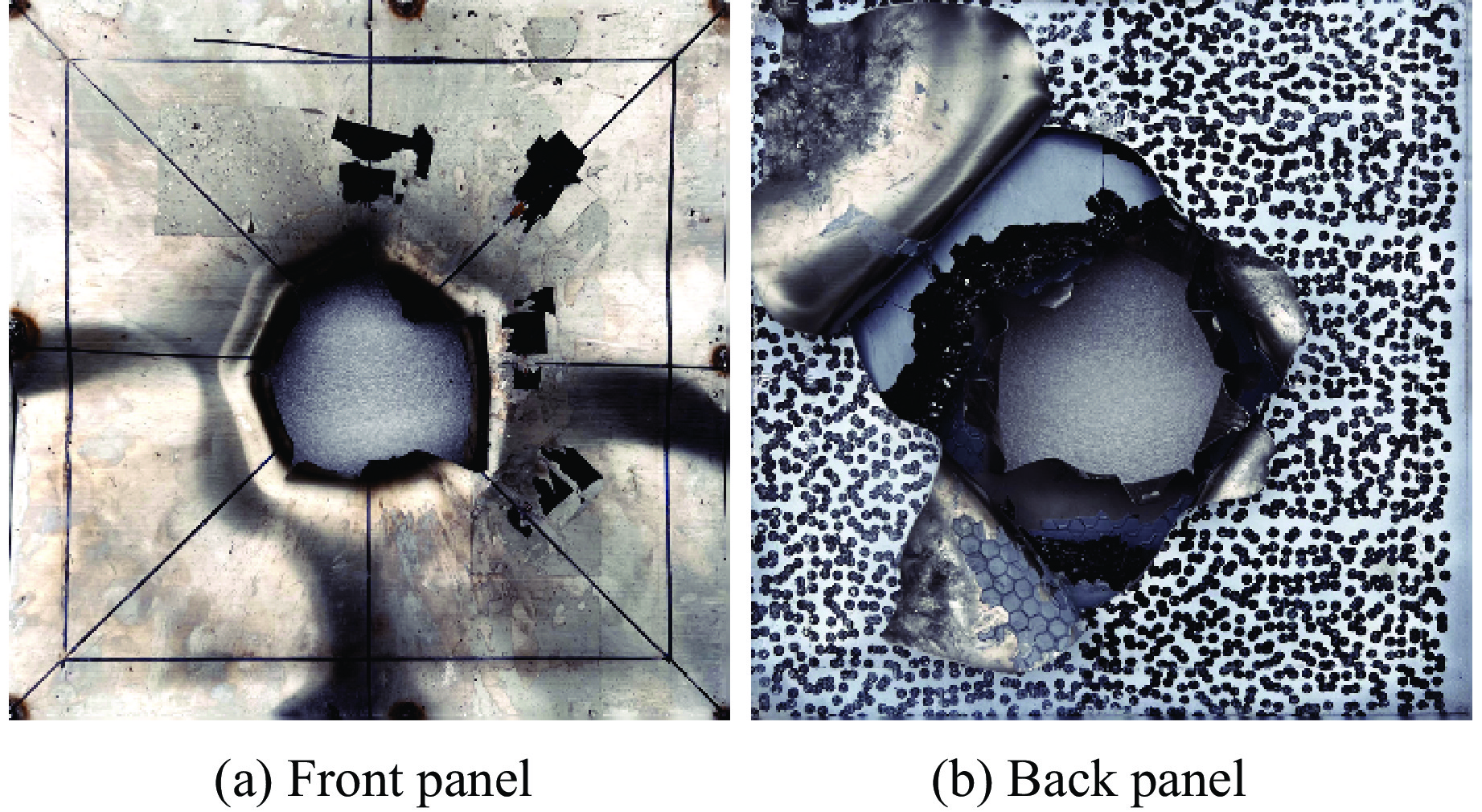 • 图7给出了E4的失效模式。从图7可以看出,在强冲击作用下,前面板主要表现为冲孔破坏,而背面板则发生严重的撕裂破坏。这表明,在未填充STG的情况下,蜂窝芯层的缓冲能力较为有限,难以有效抵御爆炸冲击能量。由于蜂窝结构本身的空腔特性,其抗冲击能力主要依赖蜂窝壁的局部屈曲和塑性变形,但在高强度爆炸冲击下,这种耗能机制不足以防止前面板的穿孔破坏,导致大量冲击能量透射至背面板,并最终引发撕裂破坏。因此,在此类极端载荷下,单纯依靠蜂窝结构难以提供有效的冲击缓冲能力。