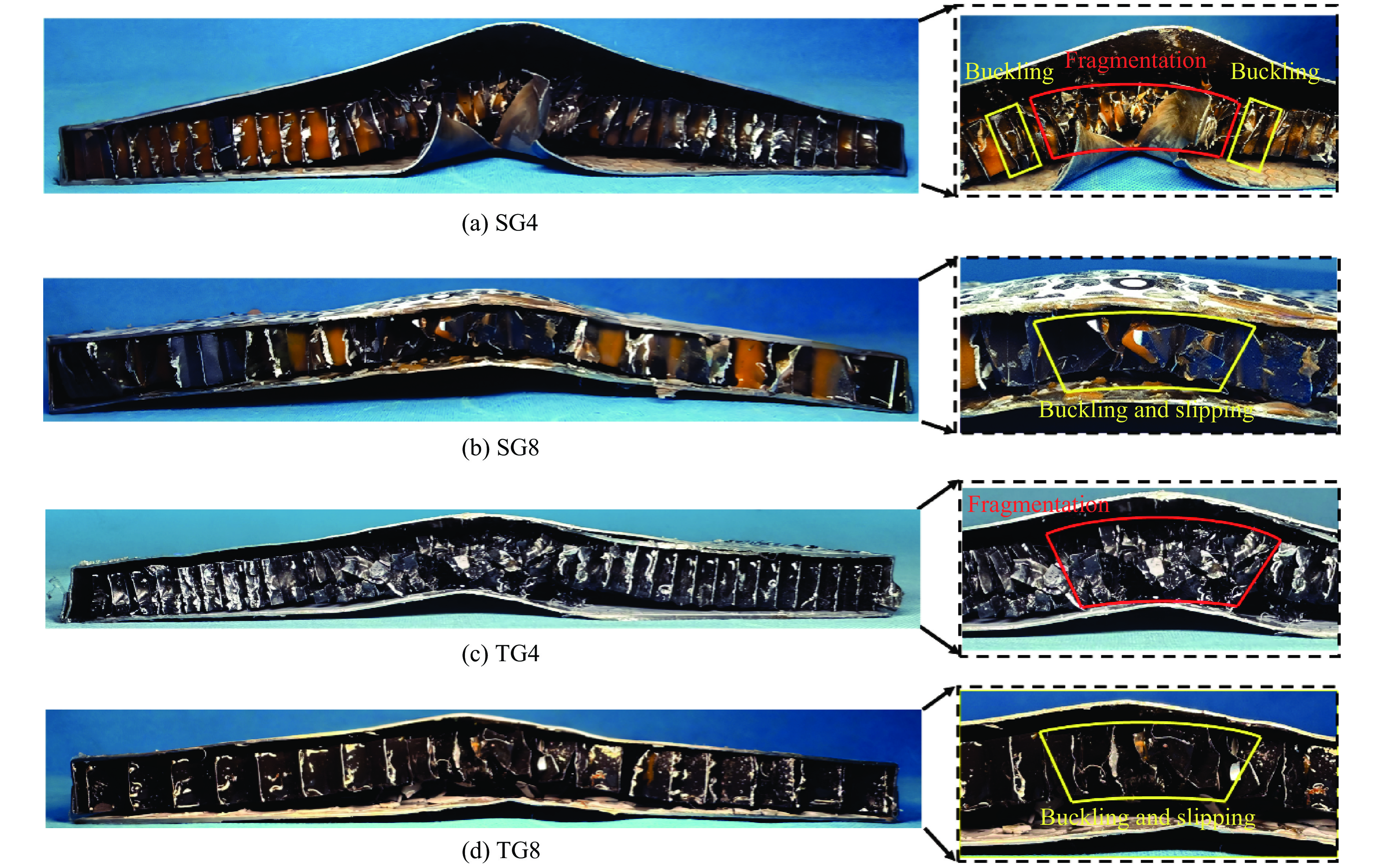 • 为了观察夹芯板内部蜂窝芯层的变形情况,沿切缝将焊点打磨移除,待STG从夹芯板中排出后,从夹芯板中心拉线处切割试件,试件剖面如图9所示。