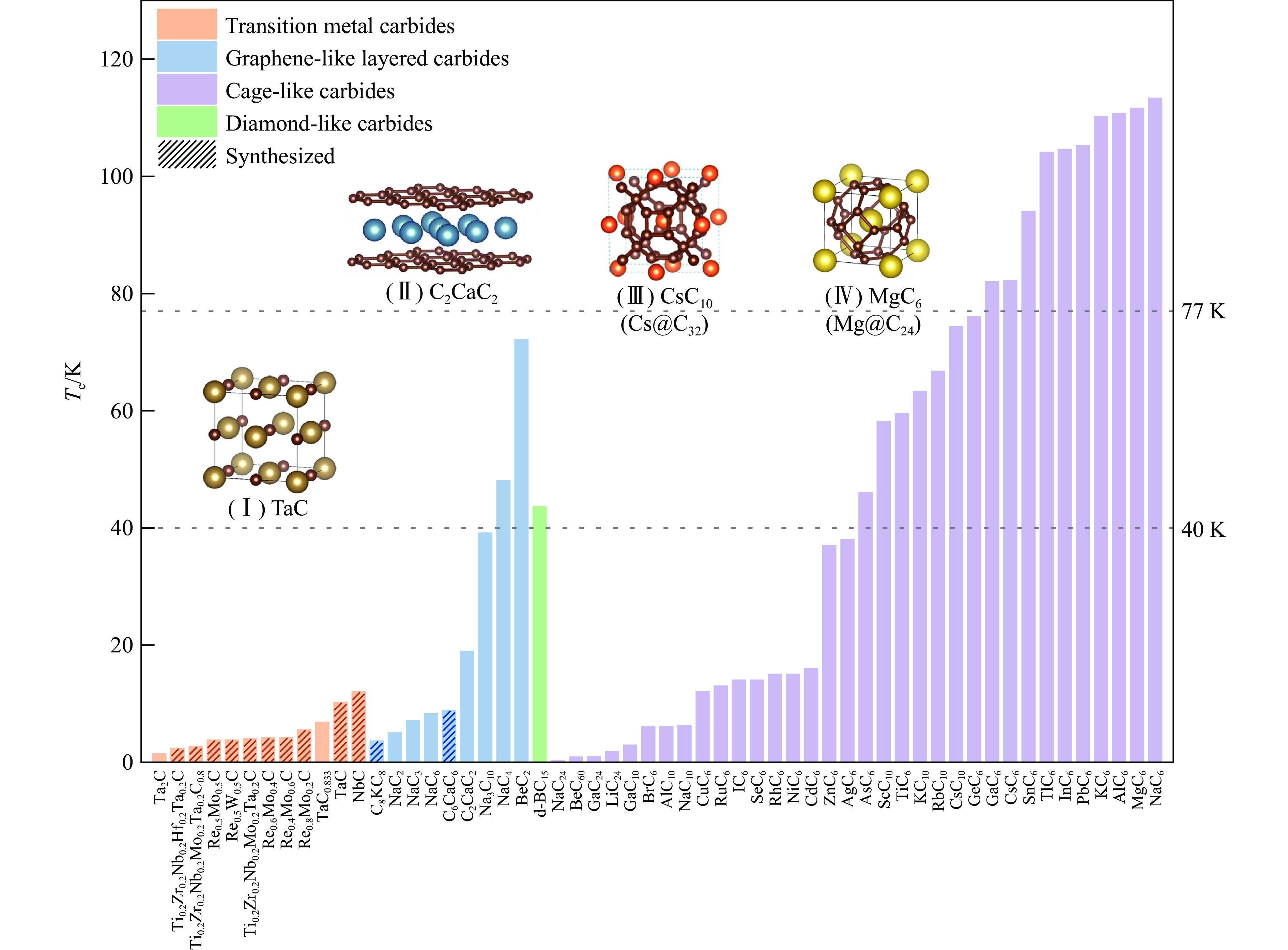• 碳作为ⅣA族元素的典型代表,是构成各种有机分子的基本元素。碳原子通过sp、sp2和sp3杂化方式,能够形成金刚石、石墨、纳米管、富勒烯等多种独特结构。这些不同的杂化类型赋予了碳基材料多样化的电子排布和化学键合特性,从而构建出具有丰富结构形态和物理化学性质的碳基材料体系。近年来,碳基超导体研究取得了显著进展,主要集中在具有类石墨烯层状结构的碳化物(graphene-like layered carbides)、笼型结构碳化物(cage-like carbides)、类金刚石结构的碳化物(diamond-like carbides),以及具有立方岩盐结构和六角形结构的过渡金属碳化物(transition metal carbides,TMCs),如图1[20, 2236]所示。