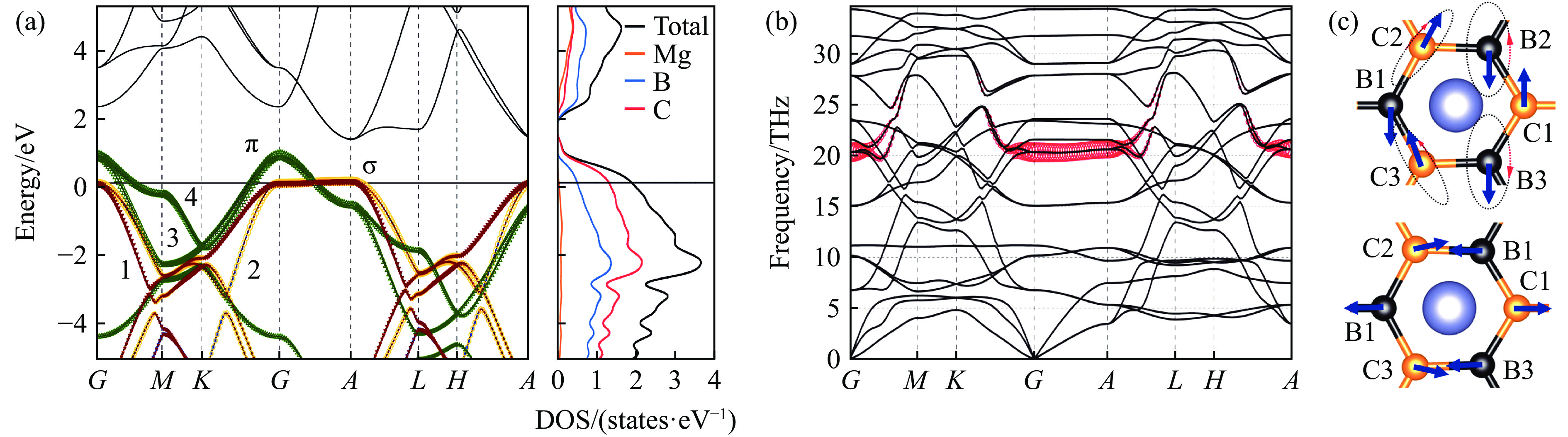 图 10  MgB3C3的能带结构和DOS (a)、声子谱(b)以及沿G-Α方向(20.3 THz)的双重简并E′声子模式振动与电子之间的强耦合(c)[16]