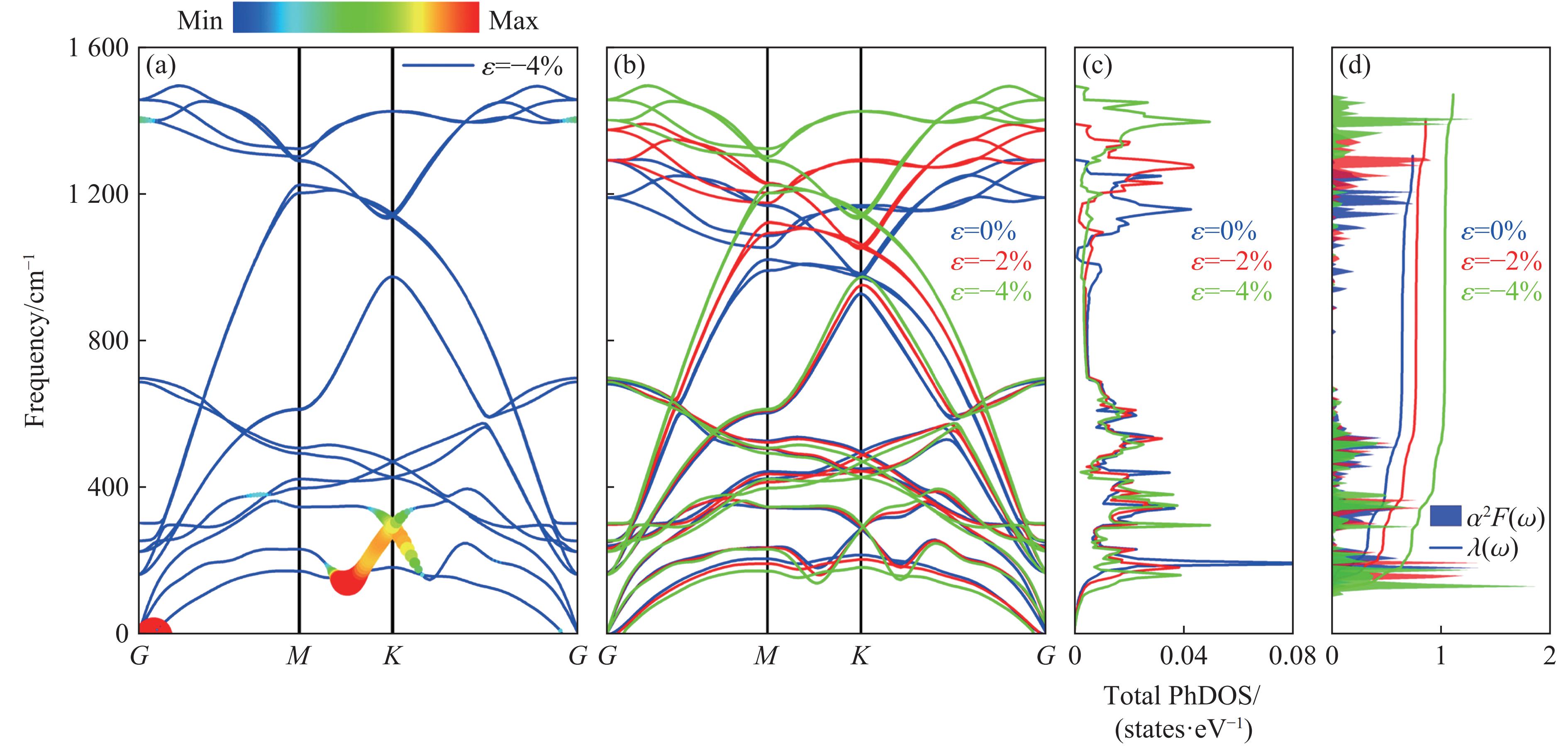 图 2  压缩应变 ε=−4%下C2CaC2的声子谱(其权重为电声耦合强度)(a)以及不同压缩应变(ε=0, −2%, −4%)下的声子谱(b)、总投影态密度(c)、Eliashberg谱函数α2F(ω)和电声耦合函数 λ(ω) (d)[25]