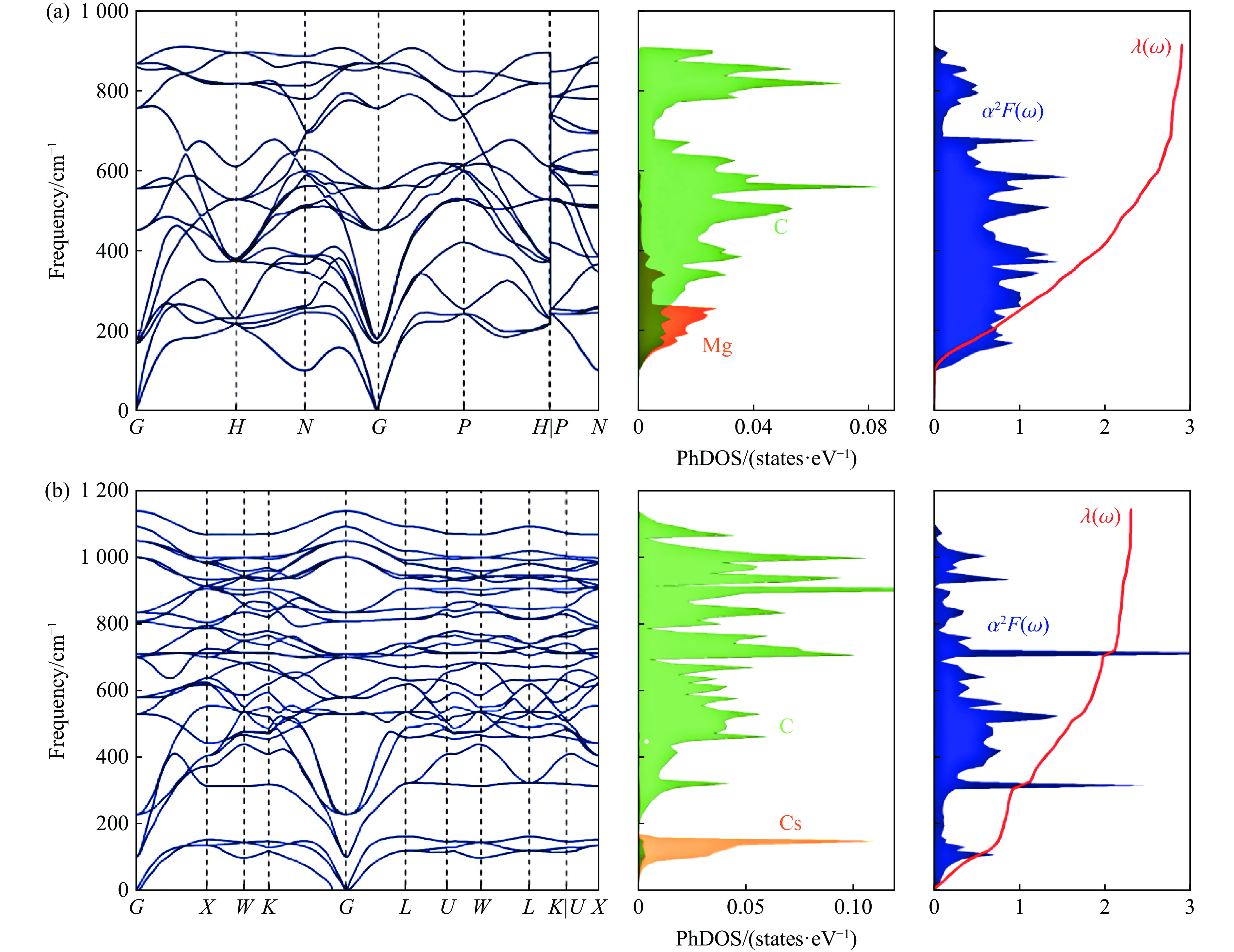 图 3  MgC6 (a) 和CsC10 (b) 的声子谱、声子投影态密度、Eliashberg谱函数以及λ(ω)[27]