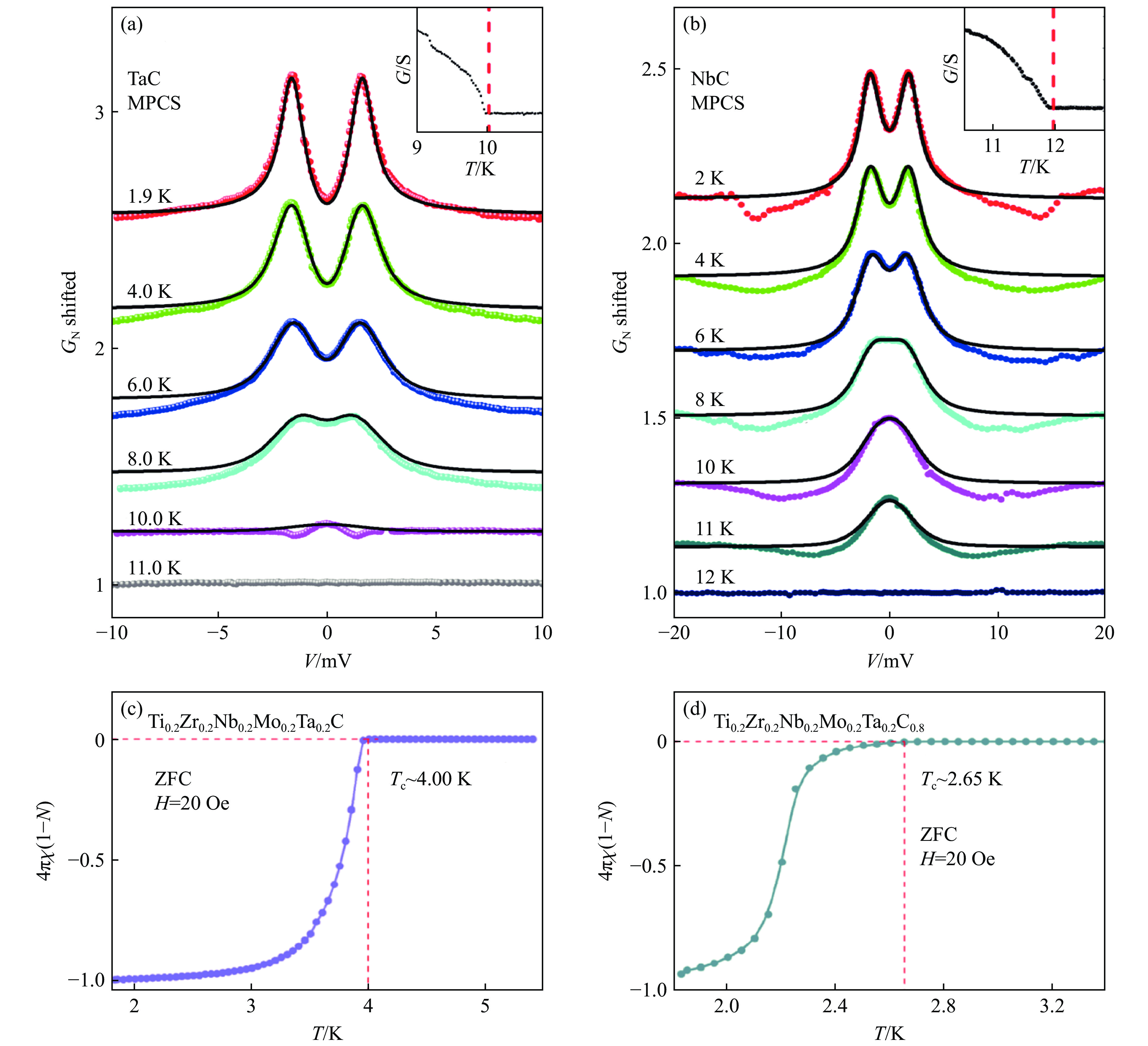 图 4  通过机械点接触光谱测得的TaC (a)和NbC (b)的电导曲线随温度的变化(插图表示零偏压电导G随温度T的变化[20])以及在磁场H=20 Oe的条件下测得的Ti0.2Zr0.2Nb0.2Mo0.2Ta0.2C (c)和Ti0.2Zr0.2Nb0.2Mo0.2Ta0.2C0.8 (d)的零场冷却体积磁化率随温度的变化[32]GN为归一化电导率,V为偏压,χ为磁化率,N为退磁因子)