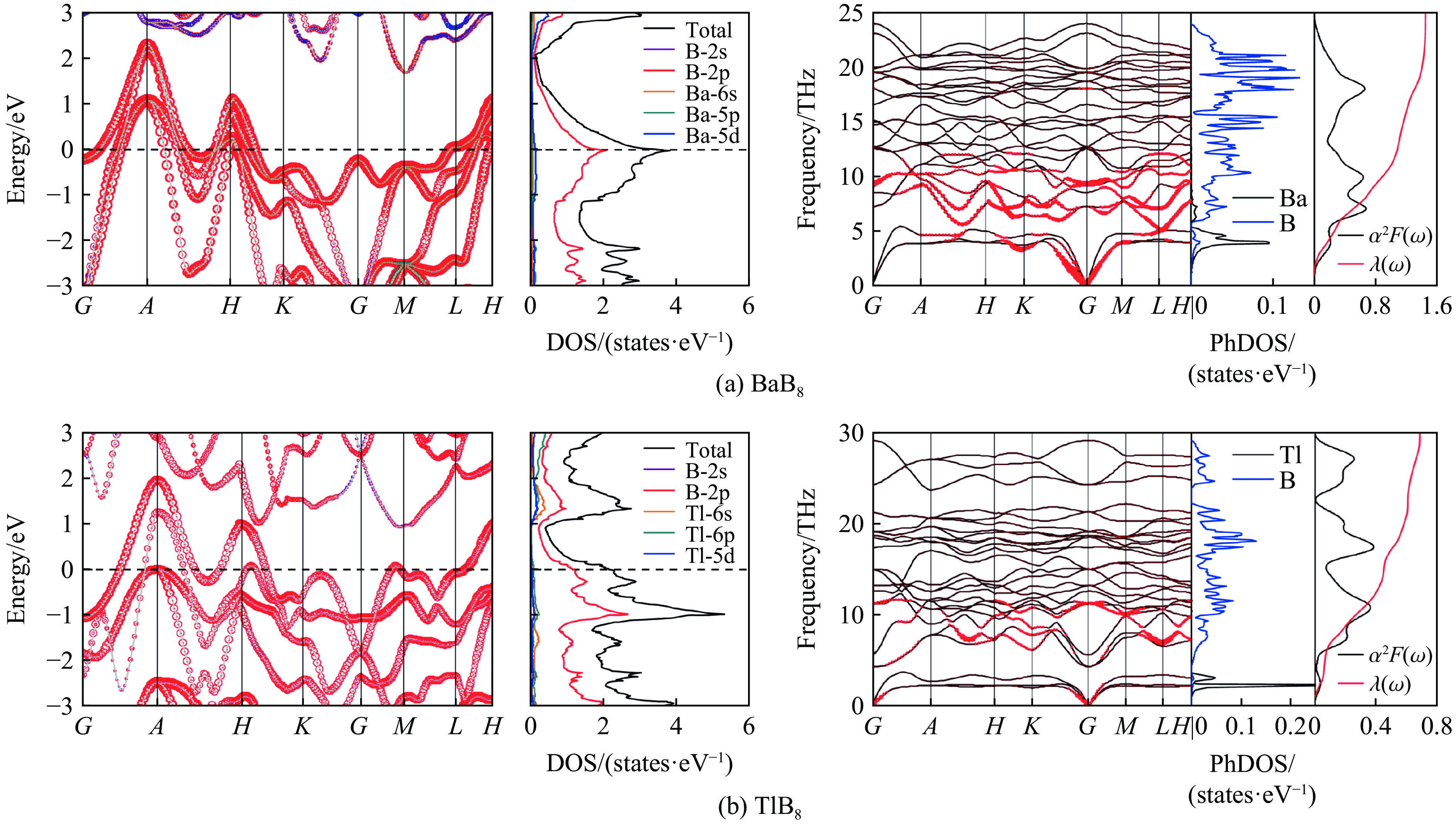 图 7  BaB8和TlB8的能带结构、DOS、声子谱、PhDOS、Eliashberg谱函数以及λ(ω)[80]