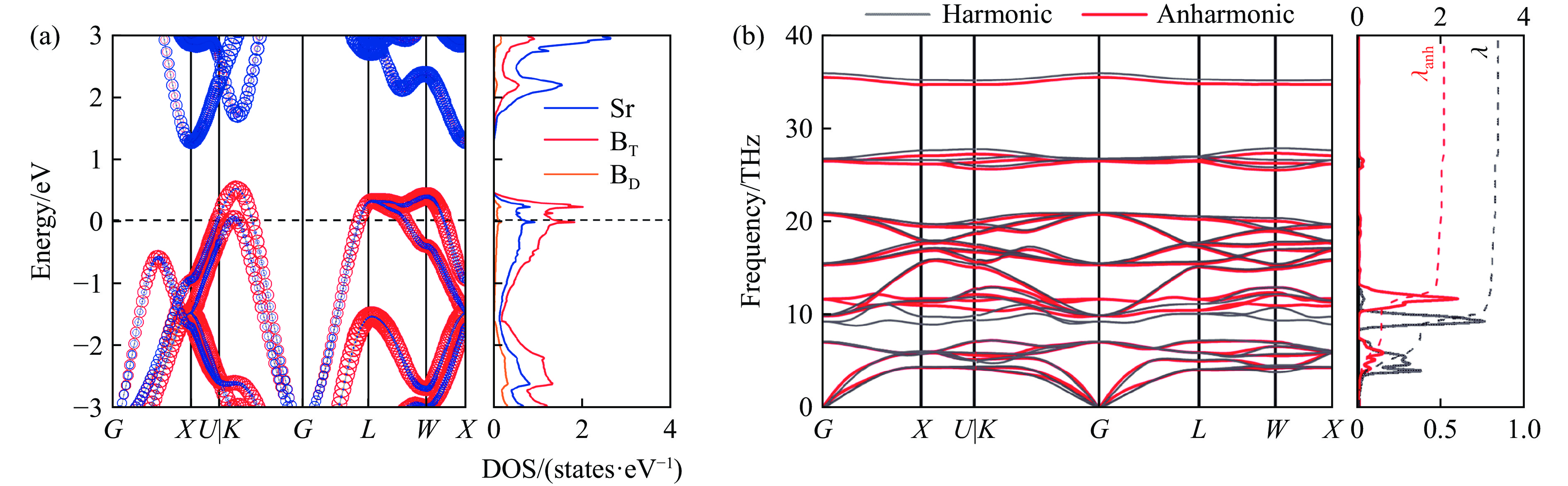 Figure 8.  (a) Band structure and DOS, (b) phonon spectra, Eliashberg spectral function, and electron-phonon coupling integral of Sr2B5 at 40 GPa[21]