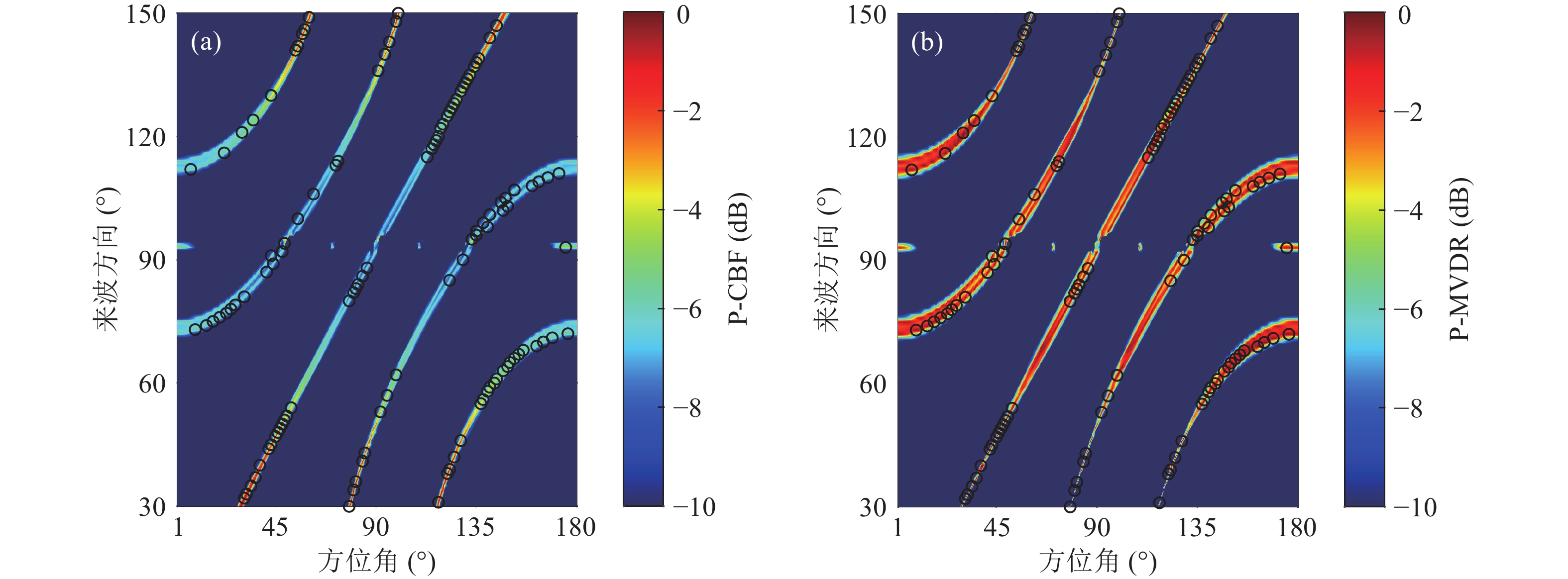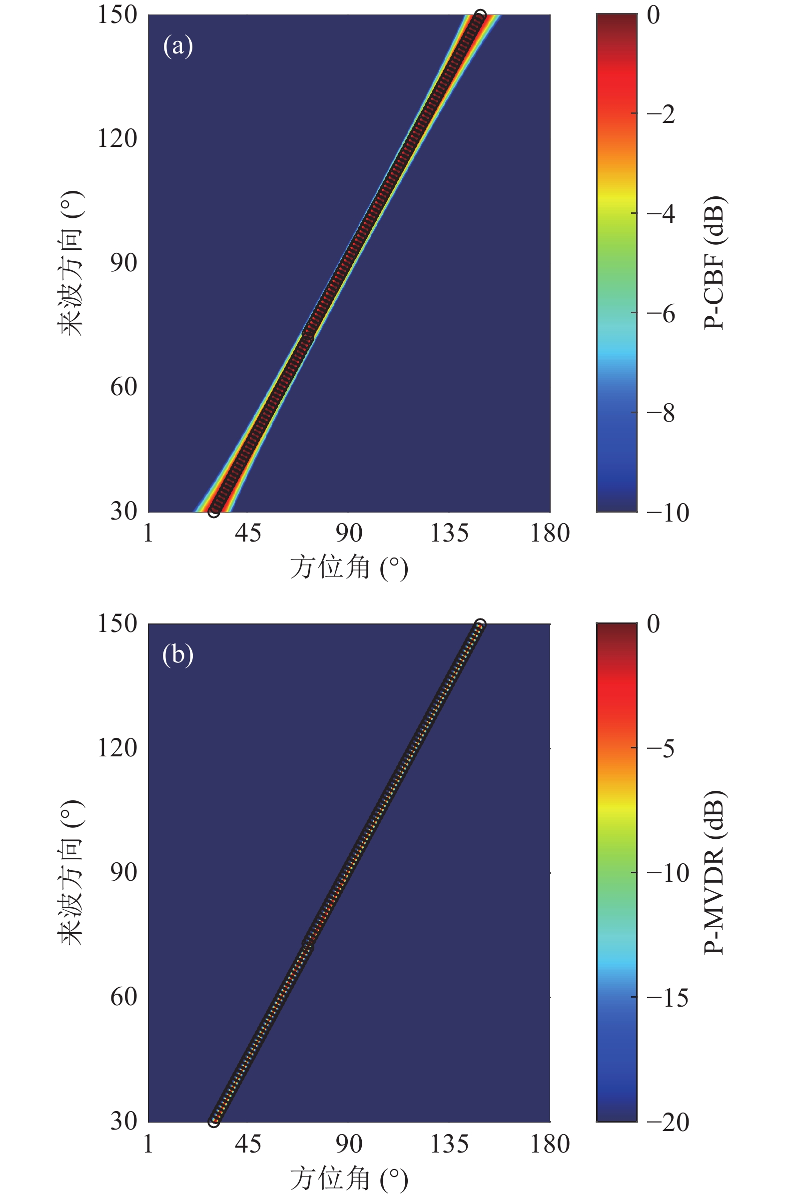 $\lambda $ 为波长。从式(6)可以看出, 对于多目标分辨, 若信号频率相同, 入射到阵列的DOA的间隔小于波束宽度, CBF将不能准确分辨目标实际的DOA, 这是CBF存在的固有瑞利准则局限性, 一般通过增加阵元间隔和增加阵元个数提高角度分辨率, 在实际应用中阵列孔径的增加有所限制。
