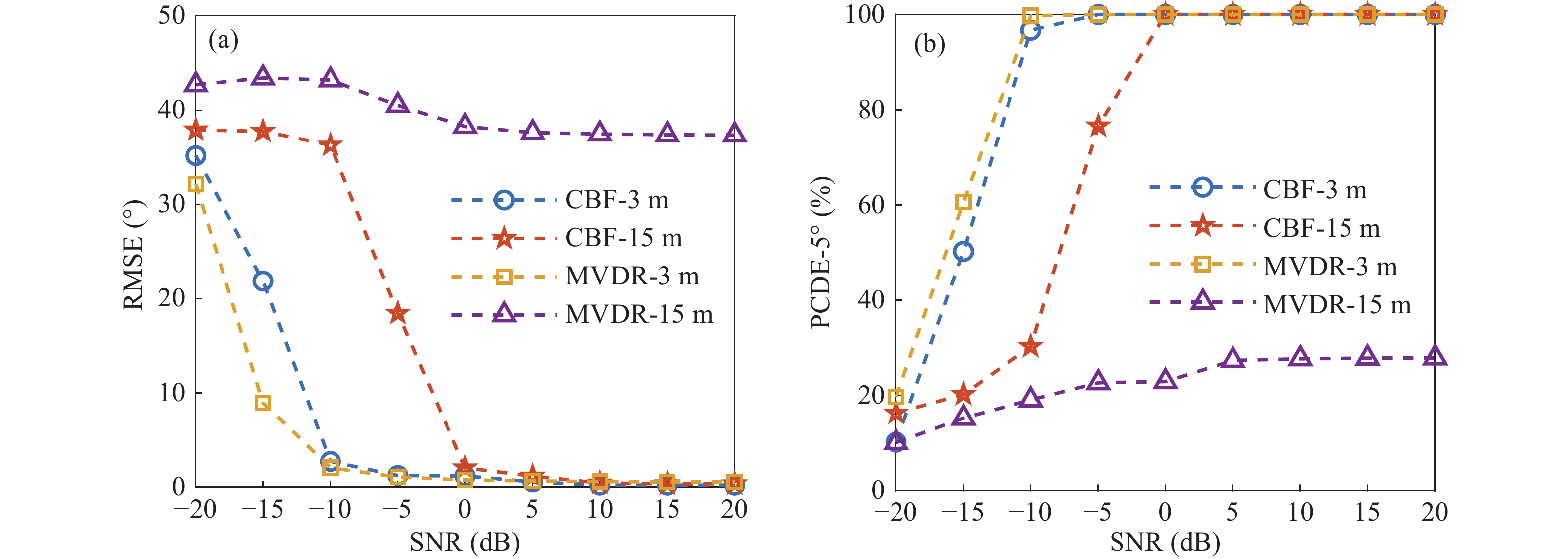 $d$ = 3 m时, CNN-CBF和CNN-MVDR性能表现差别不大, CNN-MVDR估计结果在信噪比小于−5 dB时略优于CNN-CBF。在信噪比大于等于−10 dB时, 两种估计方法的PCDE-5°均逼近100%并趋于稳定, RMSE下降到2°以下趋于稳定, 都能准确估计出DOA。两种方法对于信噪比都具有很强的宽容性。当