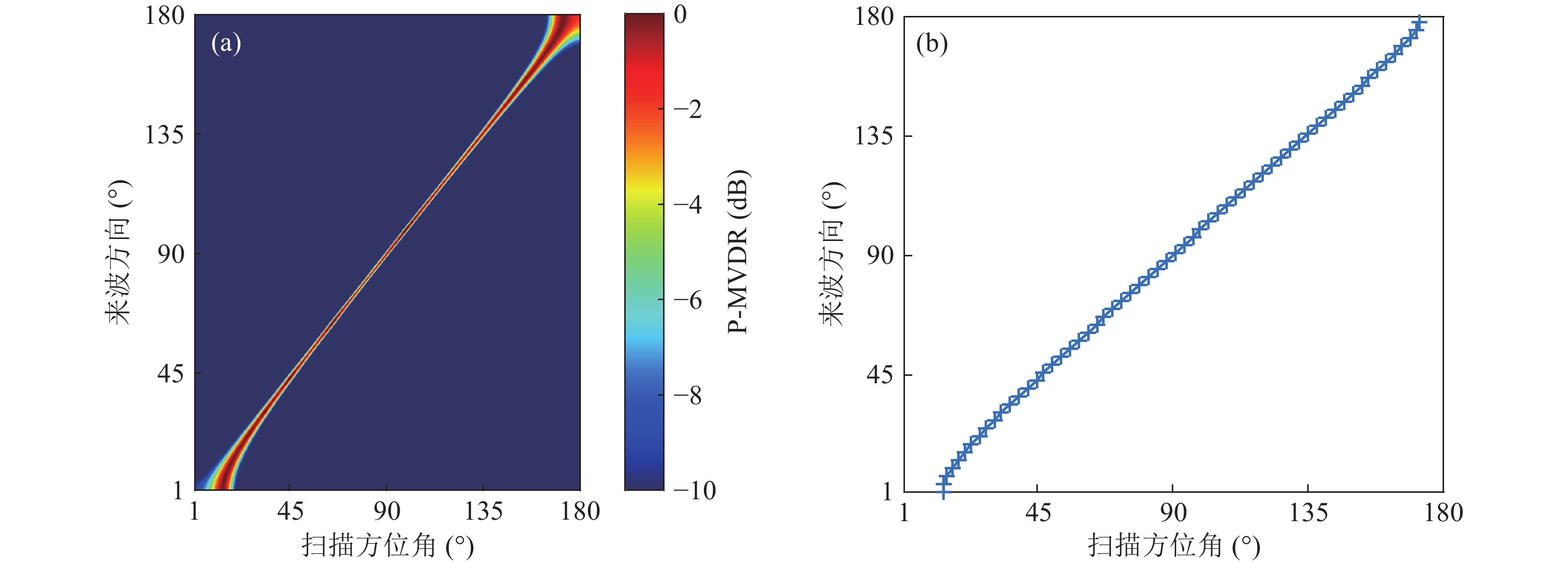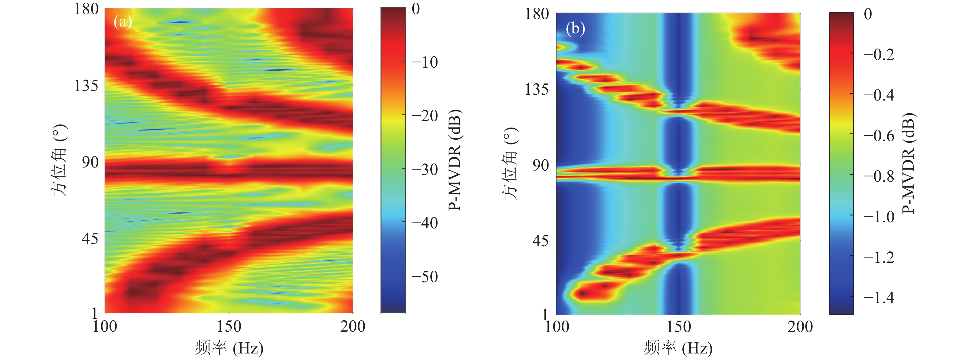 MVDR的基本原理为: 使得期望方向上的信号具有无失真输出的同时最小化噪声方差, 且在理想状态下旁瓣更窄, 主瓣更高, 但稳健性不足。基于对角加载的MVDR是指在样本互谱密度矩阵上添加对角矩阵项, 在模型失配情况下, 可以提高MVDR的输出性能。对角加载MVDR扫描波束谱为