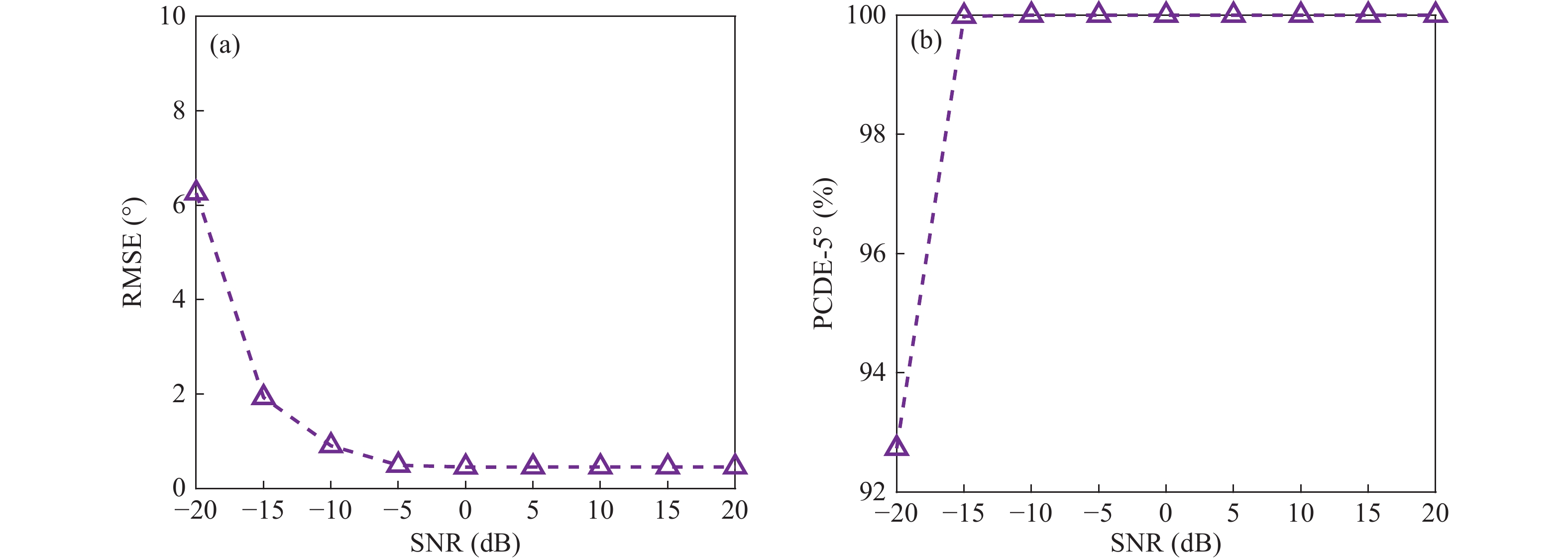 为了定量评估不同DOA估计算法下的定位性能, 定义可靠测向概率(PCDE)为DOA估计结果的绝对误差小于5°的概率, 可以反映实际各种算法预测出的DOA结果的可靠性; 均方根误差(RMSE)用于衡量预测出的DOA与真实DOA之间的偏差, 即