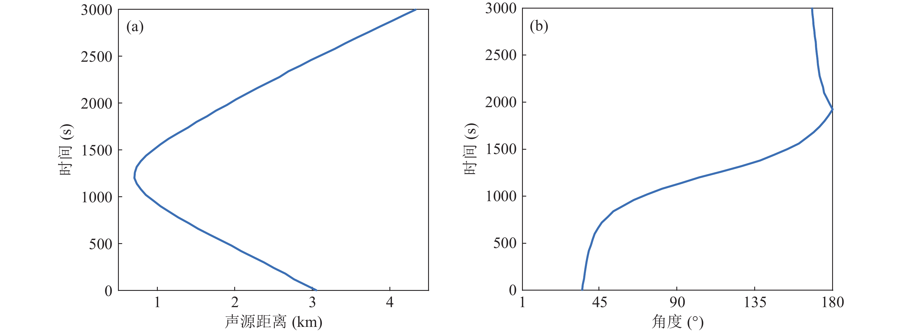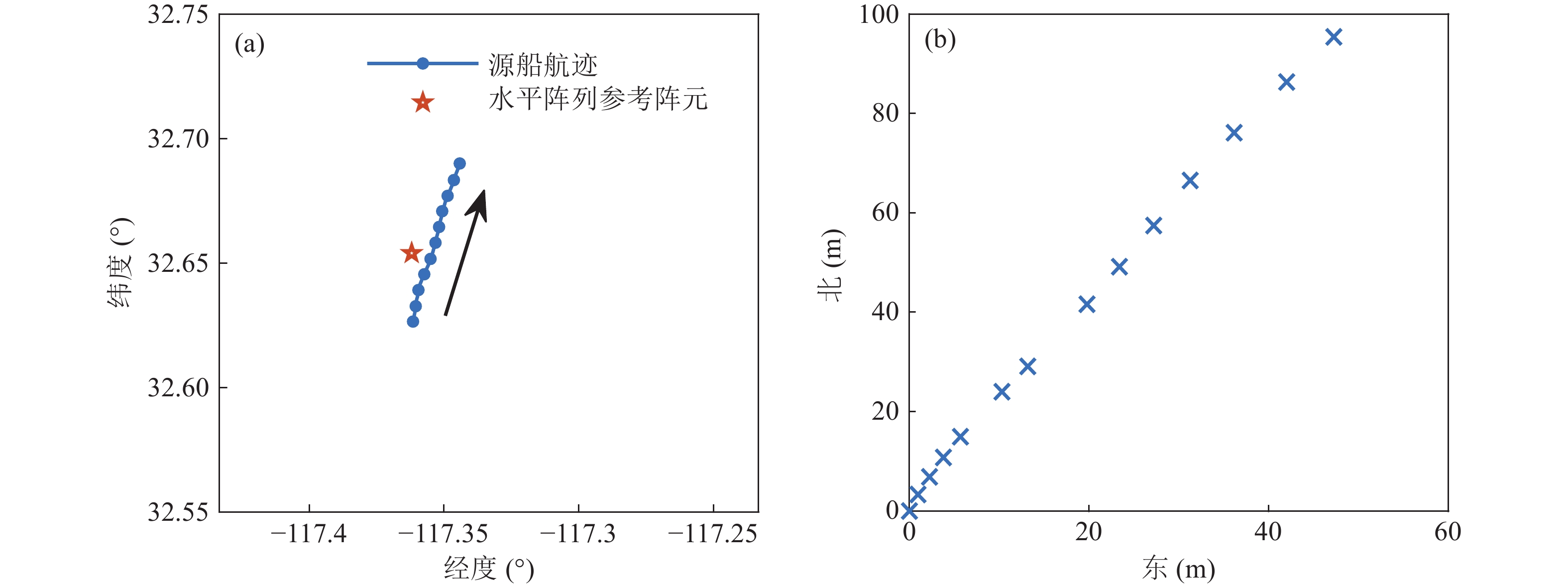 水平阵HLAN接收数据共持续50 min。源船的经纬度坐标变化如图16 (a)所示, 接收阵列位于213 m的海底, 孔径大小为240 m, 阵元个数为32 (有效个数27, 损坏5个), 阵型从形状来看呈弓形, 以前14个阵元作为子阵1, 子阵1各阵元位置如图16 (b)。声源到参考阵元(水平阵HLAN第一个阵元为(0, 0)位置, GPS已知)的距离及DOA随时间变化如图17所示, GPS记录为每1分钟记录一次, 采用插值方法计算整体真实距离及DOA数值。