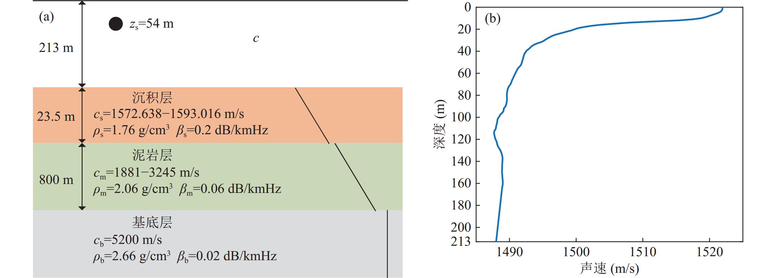 S5测线的环境模型(距离无关的浅海波导)如图18 (a)所示, 水深为213 m, 三层海底模型, 声源位于54 m。沉积层厚度为23.5 m, 沉积层顶部和底部的声速分别为1572.368 m/s和1593.016 m/s, 沉积层的密度和衰减分别为1.76 g/cm3和0.2 dB/(km·Hz)。泥岩层顶部和底部的声速分别为1881 m/s和3245 m/s, 泥岩层的密度和衰减分别为2.06 g/cm3和0.06 dB/(km·Hz)。基底层的声速、密度和衰减分别为5200 m/s, 2.06 g/cm3, 0.06 dB/(km·Hz)。声速剖面如图18 (b)所示, 为CTD记录的真实数据。