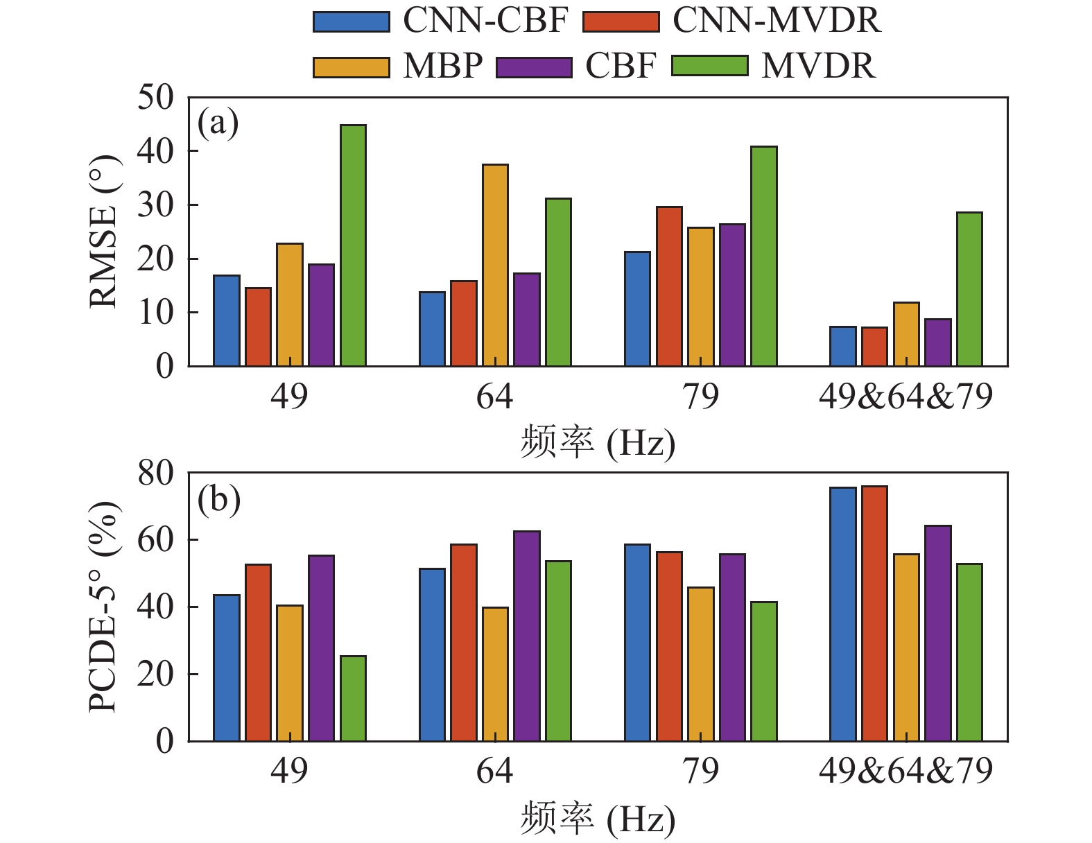 分析表6统计结果。在综合频点{49 Hz, 64 Hz, 79 Hz}条件下, 五种方法的DOA估计性能均比单频条件下有很大提升。传统波束形成方法及MBP方法的PCDE-5°不超过65%, CNN方法相比其提高了10%以上; CNN方法的RMSE也有所降低。