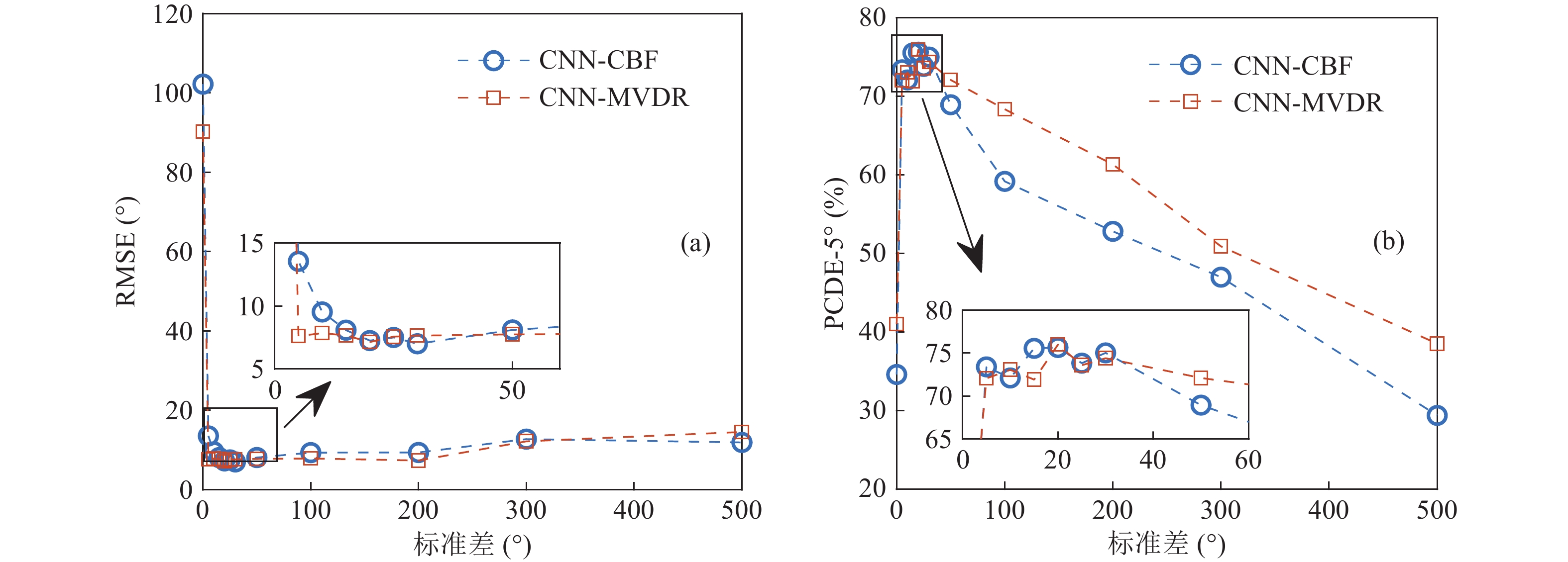 通过对比, 融合两种特征的深度学习算法在本文DOA估计任务中的PCDE-5°最高且RMSE最低, 融合后效果优于单独使用CBF和MVDR特征的训练测试结果, 且垂直连接的操作简单易实现。分析其原因可能是: CBF特征反映了扫描DOA范围内的波束谱的整体差异性, 旁瓣信息更加丰富, 主瓣更宽, 特征结构上信息量更多; 而MVDR特征在目标的真实DOA上信息更加集中, 单一的特征对于相近的不同DOA的差异的表征能力存在局限性。将CBF和MVDR两种特征按照通道数方向垂直连接起来, 可以综合利用不同特征表征出的DOA对应波束谱的敏感度信息, CNN模型可以同时学习到两个特征包含的目标方向的信息, 从而获得更完整、更准确的目标方向信息, 进一步影响DOA估计的性能。因此, 融合两种特征的CNN估计方法可以获得更好的性能。