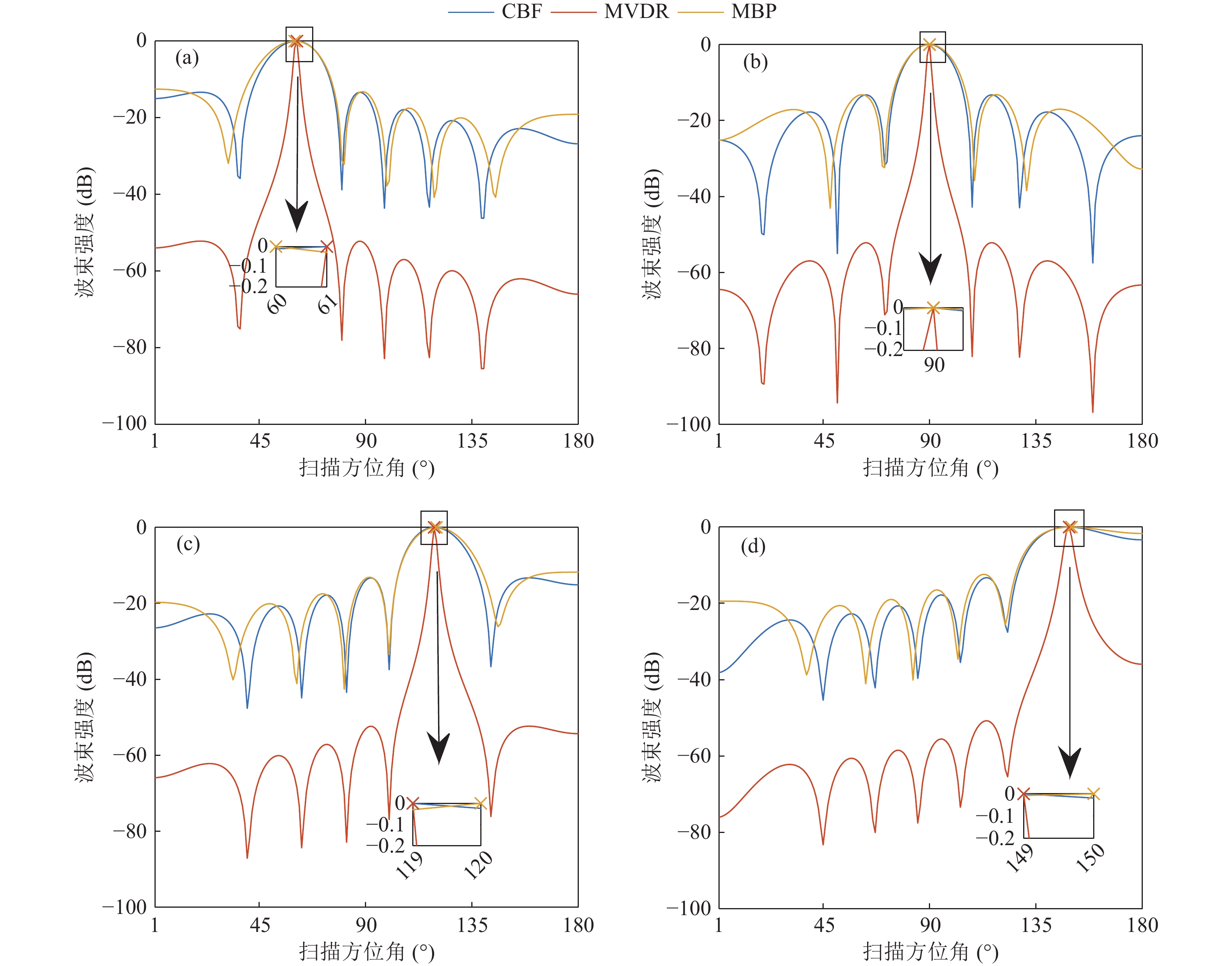分析非端射方向主瓣宽度和阵输出主旁瓣比。当来波方向为60°, 90°, 120°, 150°时, CBF、MVDR和MBP处理结果的波束谱扫描图如图4所示。波方向为60°, 90°, 120°, 150°时的