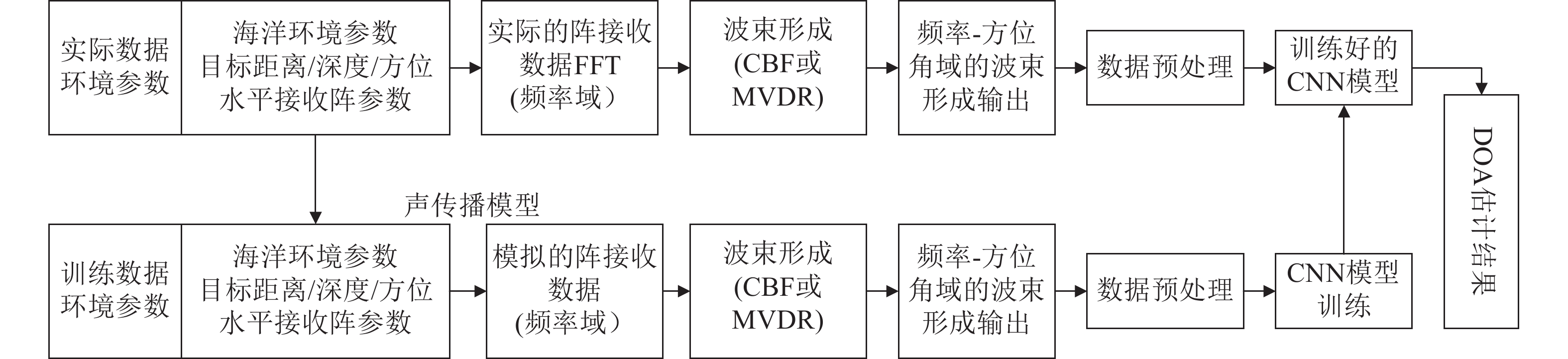 图5是本文将卷积神经网络方法应用于水声目标DOA估计的流程图。具体实现过程可以分为五个环节: 声场数据仿真、波束形成处理、数据集预处理、网络模型训练、DOA估计。