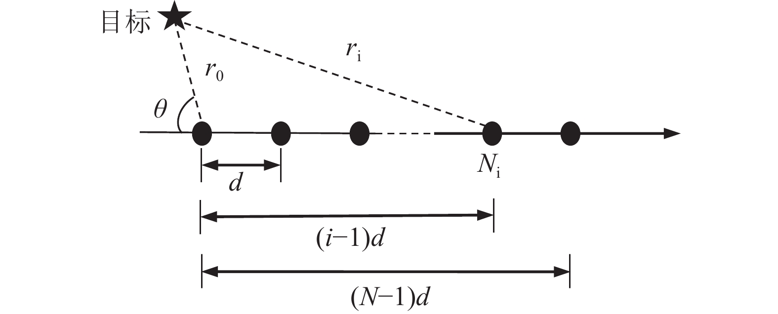 ${r_0}$ 为目标到接收线列阵参考阵元的距离,${r_i},{\text{ }}i = 1,2, \cdots ,N$ 为目标到各阵元的距离。式(15)的计算示意图如图7所示,$N$ 个阵元以间隔$d$ 均匀分布。通过扫描DOA可能存在的角度范围得到单频CBF波束谱为