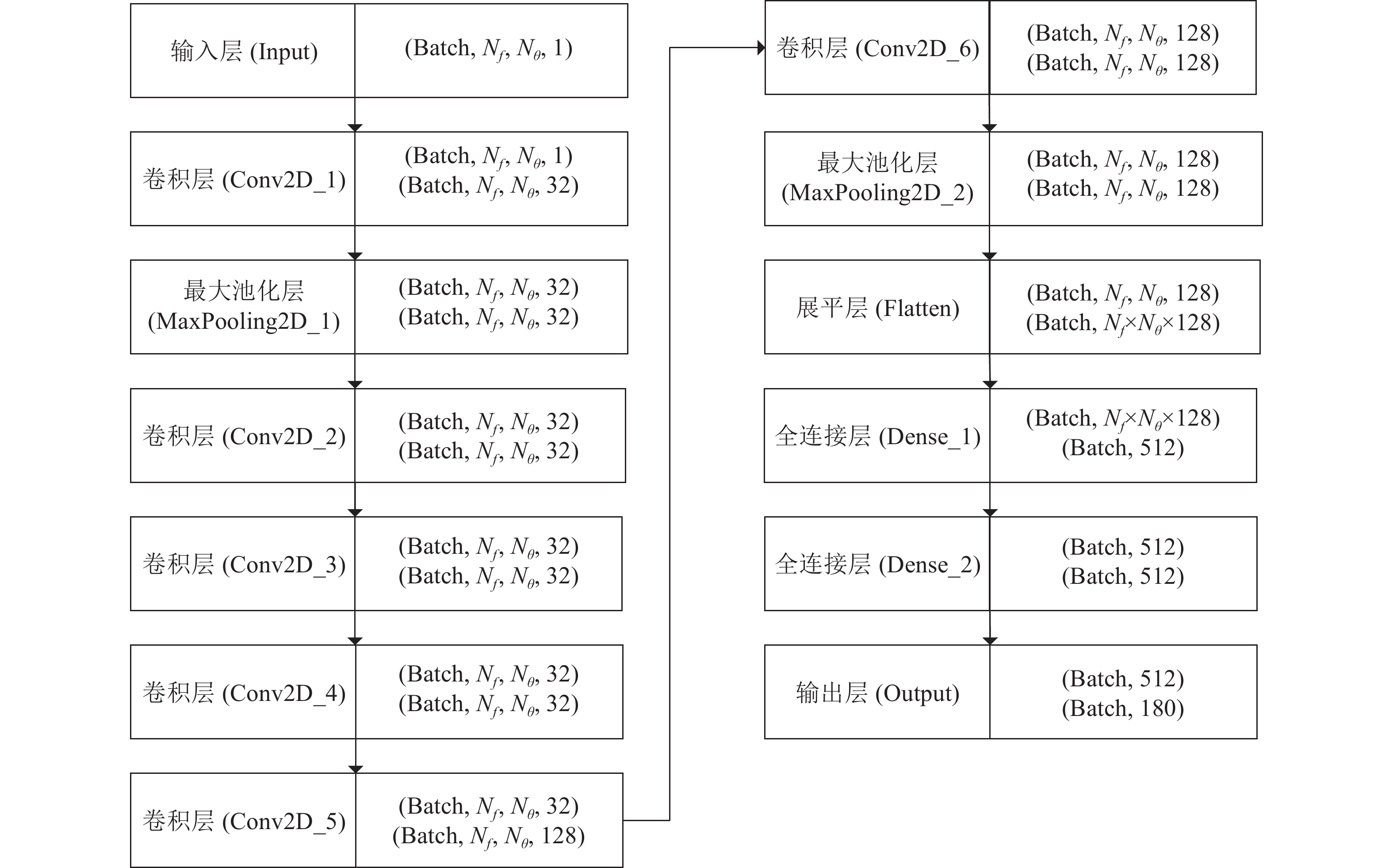 ${\theta _k}$ ,$k = 1,2, \cdots ,K$ , 对扫描角度范围以间隔$\Delta \theta $ 等间隔划分为$N$ 份, 每一个输入矩阵$ {{\boldsymbol{P}}_{\mathrm{B}}}(f,\theta ) $ , 对应一个标签向量为${{\boldsymbol{t}}_k}$ :其中,