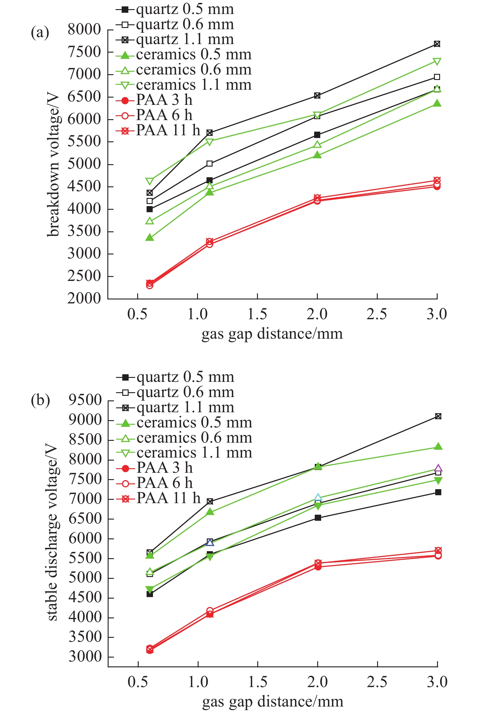 $ {\varepsilon _1} $ 、$ {\varepsilon _2} $ 、${l_{{\rm{d}}1}}$ 和${l_{{\rm{d}}2}}$ 。则有下式图10给出了应用不同介质时的击穿电压和稳定电压的比较曲线图,实验中分别采用石英、陶瓷(厚度0.5 、0.6和1.1 mm)和多孔阳极氧化铝(厚度为2.9、5.2 和9.7 μm)作为介质阻挡放电介质,放电气体间隙为0.5、1.1、2.0和3.0 mm。