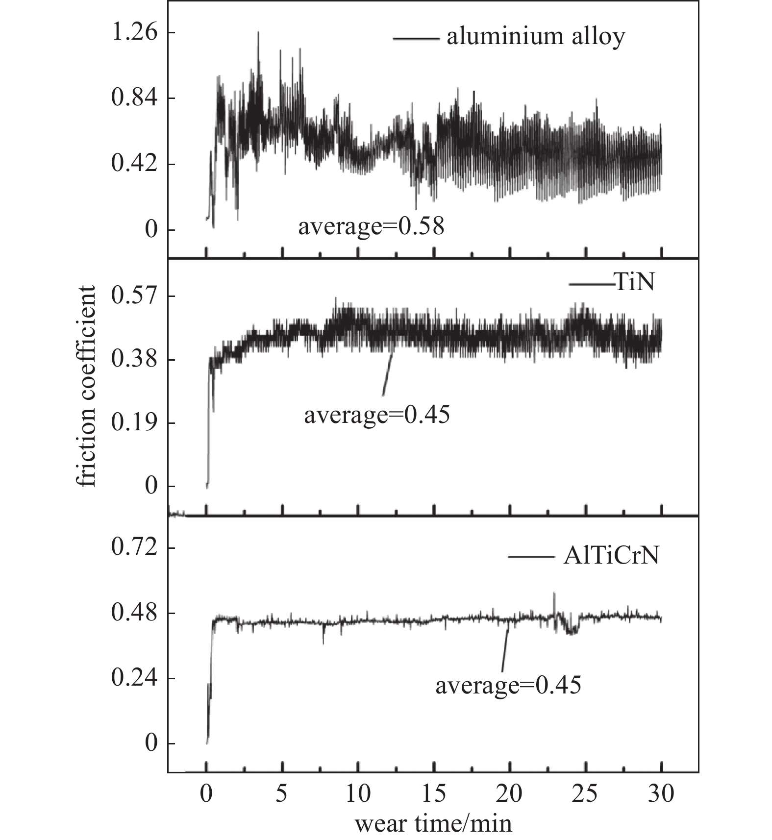 图6为铝合金基体与GCr15钢球干摩擦时的摩擦系数。从图可知,铝合金的摩擦系数明显高于AlTiCrN和TiN涂层的摩擦系数,30 min内的平均摩擦系数为0.58,且瞬时摩擦系数波动幅度很大,说明摩擦接触状态不稳定。TiN涂层的平均摩擦系数为0.45,瞬时摩擦系数波动幅度明显减小。AlTiCrN涂层的平均摩擦系数也为0.45,其瞬时摩擦系数波动幅度进一步减小,说明涂层与对磨钢球接触状态平稳。铝合金活性大,干摩擦条件下摩擦产生的热量导致温度升高,在热与力的耦合作用下铝合金很容易与对磨钢球之间产生粘结,从而导致二者之间的摩擦系数较大。AlTiCrN和TiN涂层均能起到良好的隔绝铝合金基体与对磨钢球直接接触的作用,且两种涂层均为陶瓷涂层,化学惰性较铝合金显著降低,因而涂层与对磨钢球之间的摩擦系数降低。