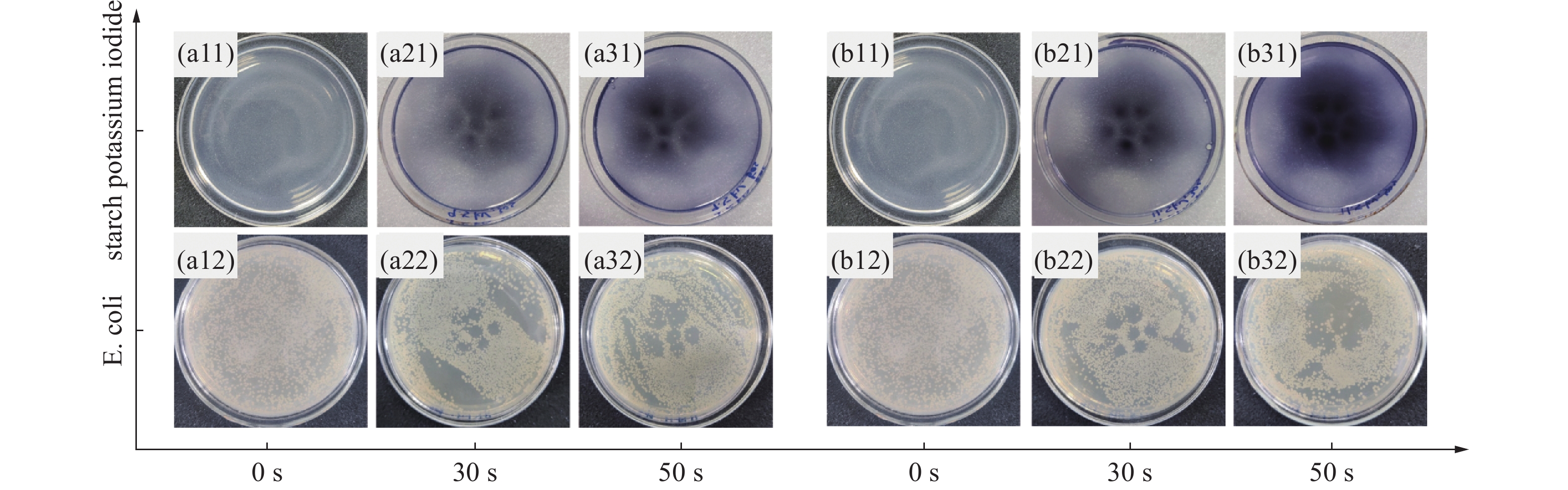 另一种是用于灭菌实验的琼脂培养基,每毫升超纯水含有以下成分:胰蛋白胨1 g,酵母提取物0.5 g,氯化钠 0.5 g,琼脂1.6 g。配置好的琼脂培养基于高压蒸汽灭菌锅中灭菌25 min。大肠杆菌原液稀释104倍,将100 μL稀释的菌液涂布在琼脂培养基上,置于等离子体发生装置下进行灭菌处理。处理后的细菌在37℃下孵育12 h,观察不同处理条件下的灭菌效果。为防止随机误差,每个样本设置三个对照组。用同样的方法处理含有淀粉-碘化钾的琼脂平板,以研究该装置产生的活性物质分布与灭菌范围之间的关系。