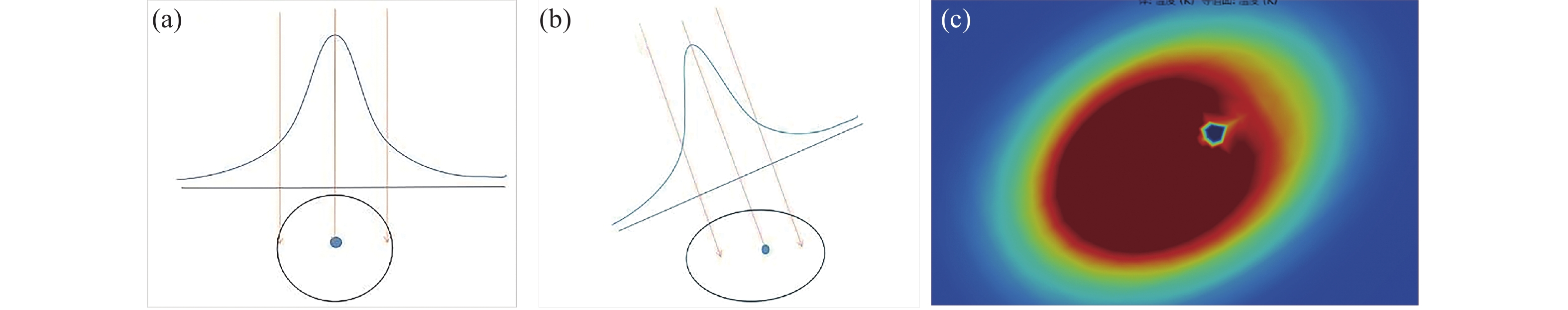 Figure 1. Schematic diagram of the phenomenon and causes of the deviation of the damage point from the center. (a) The schematic diagram of laser normal incidence, (b) the schematic diagram of laser oblique incidence, (c) the simulation diagram of laser oblique incidence