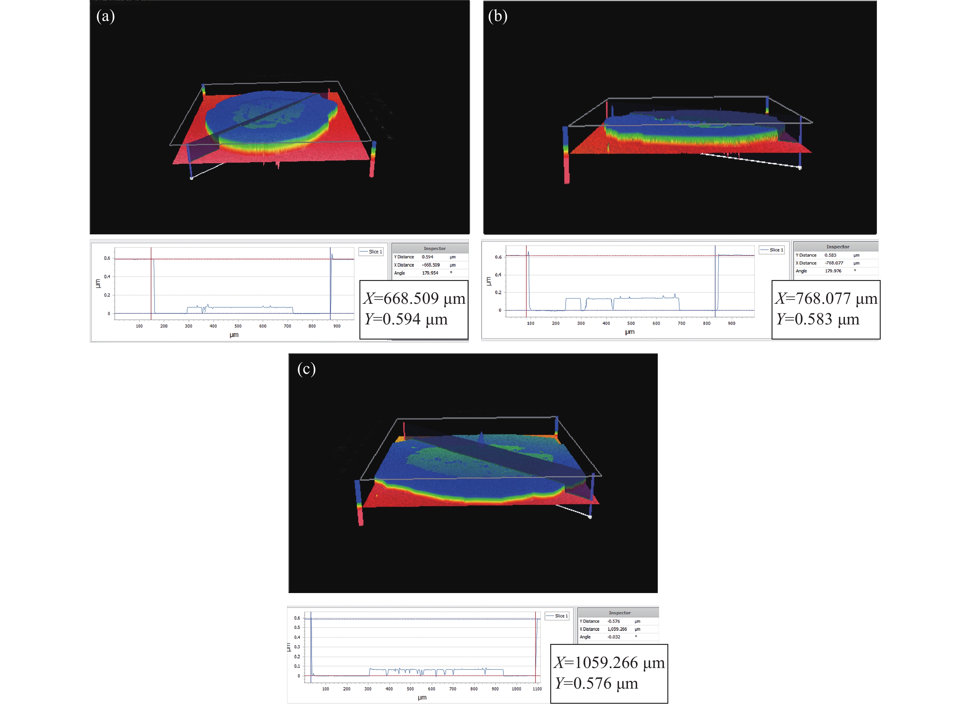 基于Zygo白光干涉仪测得的薄膜损伤形貌如图所示。由图9可知,保持激光入射角度恒定不变的情况下,呈现这样的现象:纳秒激光器发射出不同能量的激光束与薄膜相互作用时,导致薄膜纵向损伤深度随着激光能量的增加而加深,即激光能量越大,薄膜的损伤深度越深。这是因为,激光能量越大,薄膜材料中的电子将受到更强的束缚,从而增加了薄膜中的电子对激光能量吸收的效应,这意味着更多的光能被吸收并转化为热能,进而加剧了薄膜的损伤程度。由图10可知,保持激光器输出的激光能量为100 mJ不变时,呈现这样的现象:激光诱导薄膜损伤的纵向深度随着激光入射角度变大而变浅,这意味着,随着激光的入射角度变大,激光诱导薄膜损伤程度会减轻,与此同时,激光入射角度越大,薄膜表面的损伤范围扩大,即纳秒激光诱导薄膜损伤的损伤斑面积随着入射角度变大而增大,同样的激光功率分布在更大的区域上,导致薄膜表面损伤区域接收到的激光功率密度降低,所以入射角度越大,薄膜越不容易发生损伤。实验测得的数据和仿真分析得到的数据大体一致,即激光入射角度越大,薄膜的损伤斑最大尺寸越大,薄膜的损伤最大深度越浅,薄膜越不容易发生损伤。