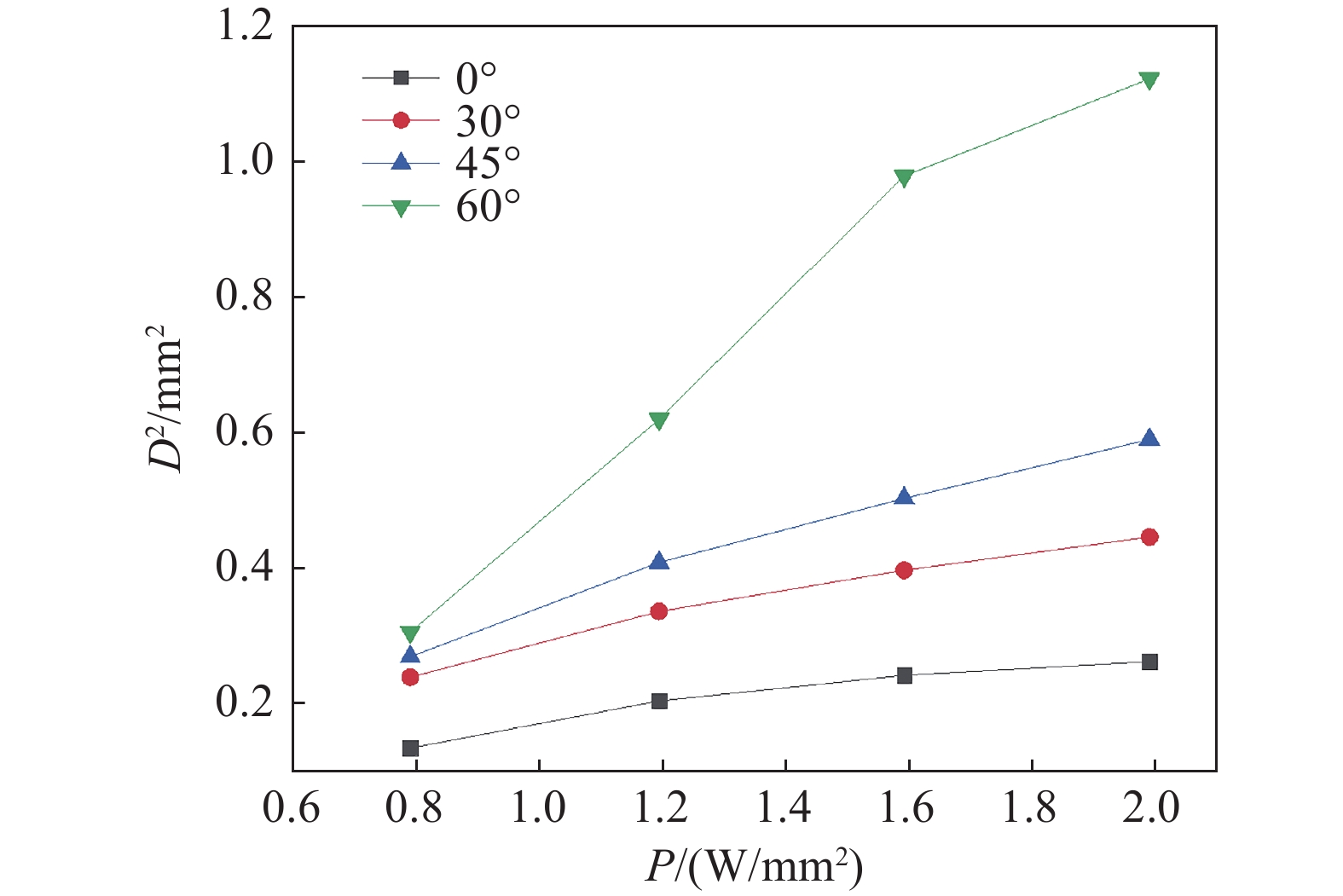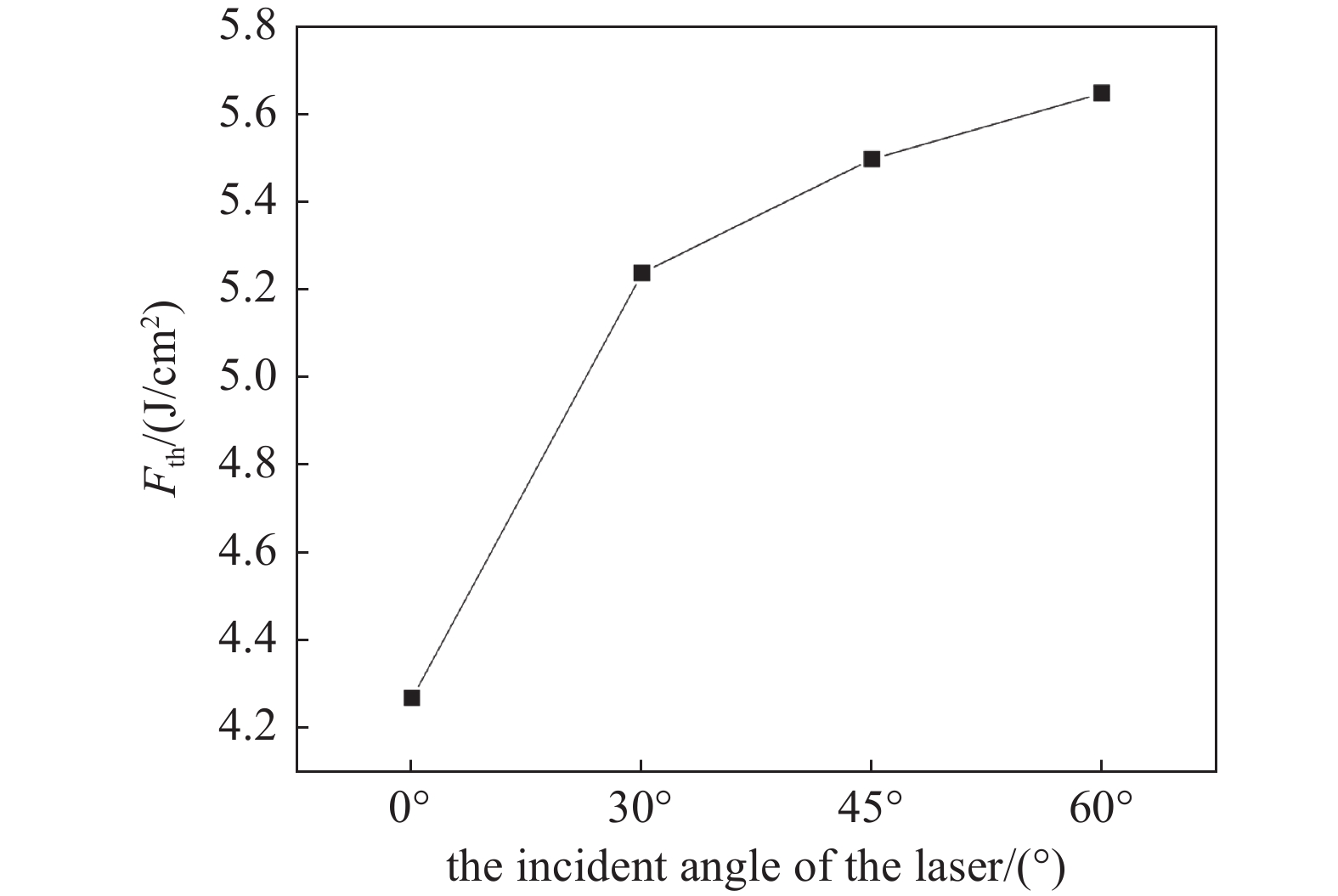 ${\omega _0}$ 为焦斑半径;P为激光平均功率密度;$ {F}{_{{\mathrm{th}}}} $ 为薄膜的激光损伤阈值。通过理论计算和线性拟合可获得激光入射角度与薄膜的激光损伤阈值之间的关系曲线图,如图13所示。由图13可知,当激光入射角度变大,薄膜的激光损伤阈值会随之增加。要使纳秒激光诱导薄膜的损伤阈值最小,此时激光入射角度应为0°,对应的二氧化铪薄膜损伤阈值为4.27 J/cm2,若要使纳秒激光诱导薄膜的损伤阈值最大,此时激光入射角度应为60°,对应的二氧化铪薄膜损伤阈值为5.65 J/cm2。出现这种现象的原因可以解释为:在激光与薄膜材料相互作用的过程中,当激光以较大入射角度与薄膜相互作用时,激光辐照在薄膜表面的光斑最大尺寸也会变大,这种变化导致了薄膜表面的损伤光斑面积变大,进而使得激光诱导薄膜发生损伤的最大深度变浅,在这一过程中可知,在相同激光功率辐照的条件下,由于光斑面积增大,薄膜表面损伤区域接收到的激光能量密度下降,这意味着在薄膜表面产生的热量积累也会减少,即辐照在薄膜表面产生的温升变小。因此,可以推断,在输出激光功率保持不变的前提件下,薄膜的激光损伤阈值随着激光入射角度的增大而变大,意味着激光入射角度越大,薄膜越不容易发生损伤,即薄膜抗激光损伤能力增强。
