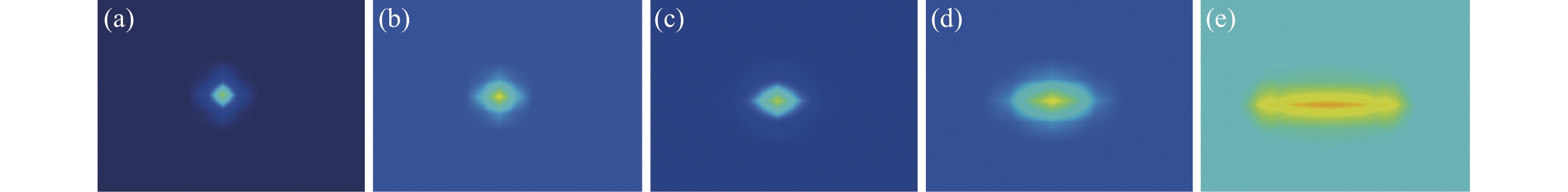 Figure 2. Plot of the distribution of laser spot on the surface of HfO2 thin film varies with the change of the incident angle of the laser. (a) The distribution of laser spot on the surface of the film when the incident angle of the laser is 0°, (b) the distribution of laser spot on the surface of the film when the incident angle of the laser is 30°, (c) the distribution of laser spot on the surface of the film when the incident angle of the laser is 45°, (d) the distribution of laser spot on the surface of the film when the incident angle of the laser is 60°, (e) the distribution of light spots on the surface of the film when the incident angle of the laser is 80°