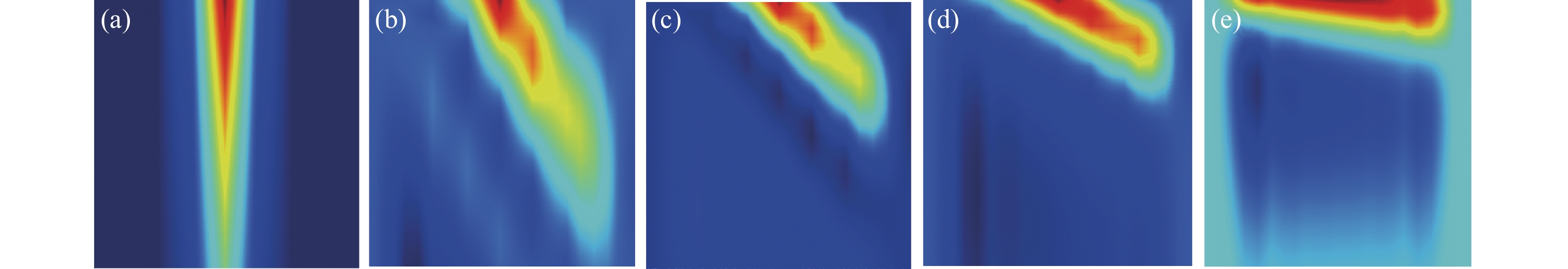 图 3 HfO2薄膜内部光场分布随着激光入射角度的变化图。(a) 激光入射角度为0°时薄膜内部的光场分布,(b) 激光入射角度为30°时薄膜内部的光场分布,(c) 激光入射角度为45°时薄膜内部的光场分布,(d) 激光入射角度为60°时薄膜内部的光场分布,(e) 激光入射角度为80°时薄膜内部的光场分布