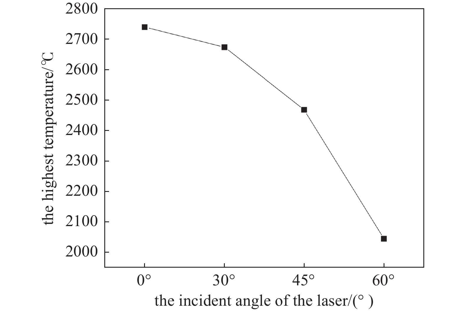 脉冲能量为10 mJ的激光束分别为以入射角度为0°、30°、45°、60°与薄膜相互作用时,薄膜表面损伤斑中心点的最高温度随着激光入射角度变化的情况如图4所示。