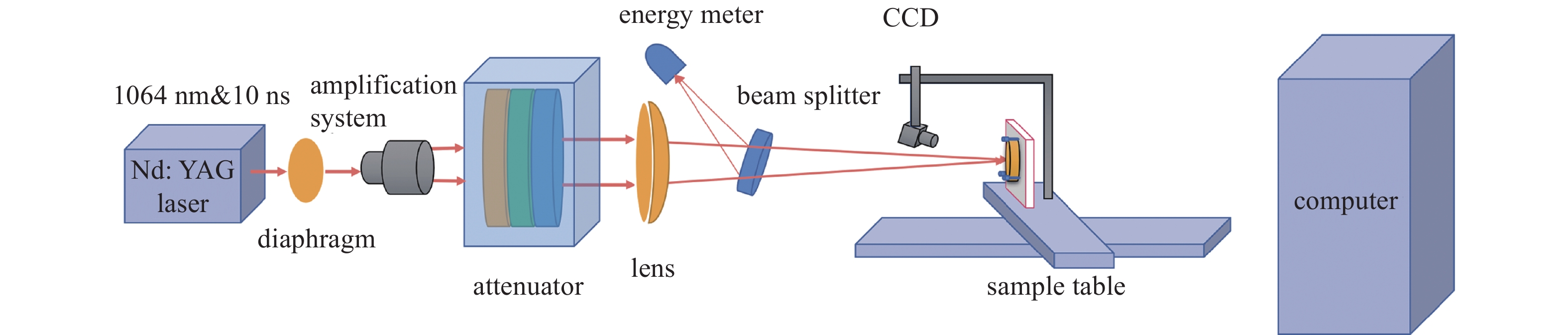 采用输出波长为1064 nm,脉冲宽度为10 ns的Nd:YAG激光器来进行实验,最大输出脉冲的能量可以达到200 mJ,工作频率10 Hz,激光正入射时的光斑直径大小为0.8 mm,激光器参数见表3。实验采用的能量衰减系统是根据计算机预设的算法,通过调节衰减器等部件来实现对激光能量的间接调控。在激光器工作时,能量计可以对出射激光光束的脉冲能量进行实时监控,当激光辐照到样品表面时,CCD相机将实时获取被激光辐照后的样品表面损伤形貌[6],三维平移台可以实现激光斜入射至样品表面。激光器参数如表3所示,测试装置原理示意图如图5所示。