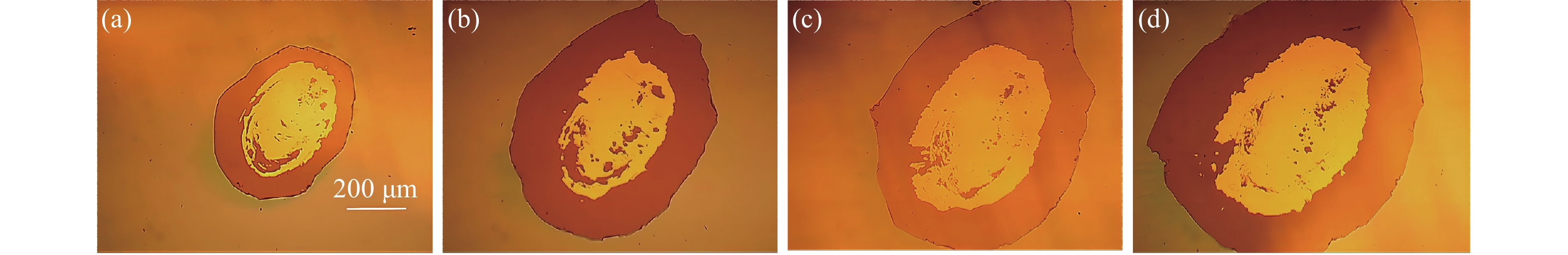 图 7 入射角度为60°的激光束与薄膜作用时的表面损伤形貌随激光能量的变化图。(a) 激光能量为40 mJ时薄膜表面的损伤形貌, (b) 激光能量为60 mJ时薄膜表面的损伤形貌,(c) 激光能量为80 mJ时薄膜表面的损伤形貌,(d) 激光能量为100 mJ时薄膜表面的损伤形貌