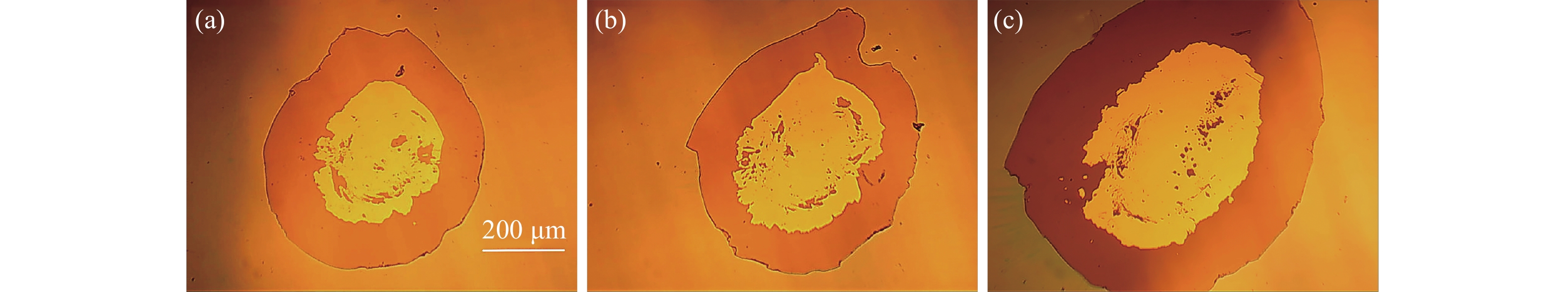 图 8 能量为100 mJ的激光束与薄膜作用时的表面损伤形貌随激光入射角度的变化图。(a) 激光入射角度为30°时薄膜表面的损伤形貌,(b) 激光入射角度为45°时薄膜表面的损伤形貌,(c) 激光入射角度为60°时薄膜表面的损伤形貌