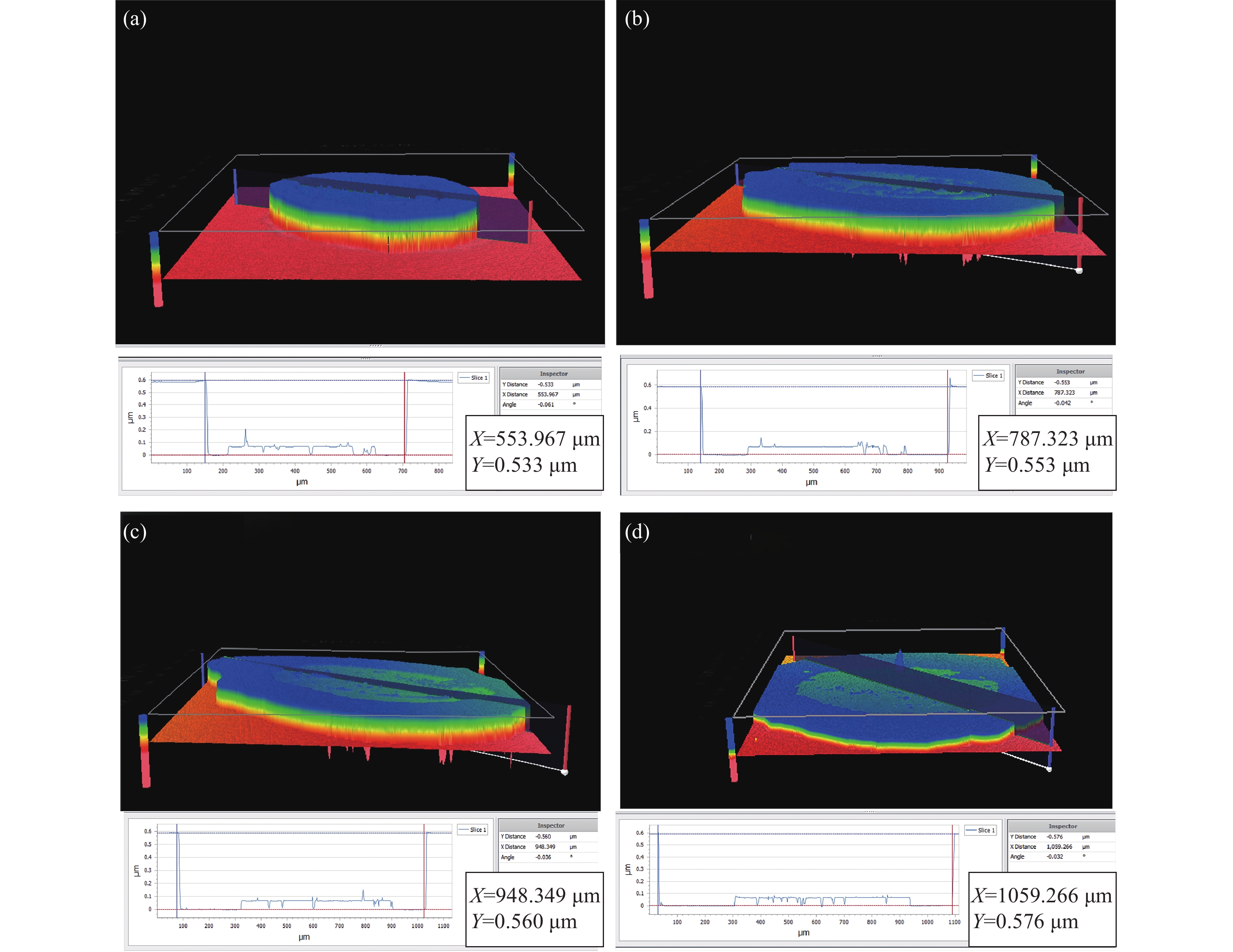 Figure 9. Plot of the longitudinal damage depth of laser-induced thin film as a function of laser energy at an incident angle of 60°. (a) The damage depth of the film at the energy of the laser is 40 mJ, (b) the damage depth of the film at the energy of the laser is 60 mJ, (c) the damage depth of the film at the energy of the laser is 80 mJ, (d) the damage depth of the film at the energy of the laser is 100 mJ