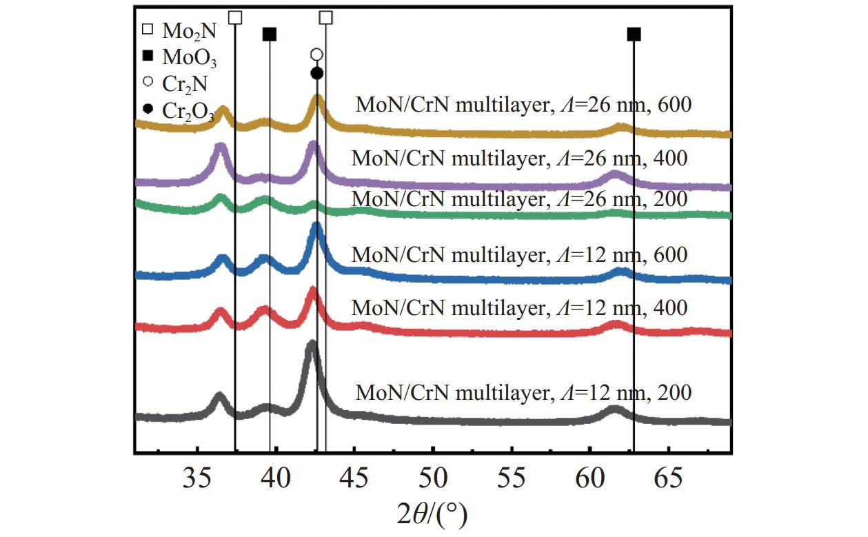 MoN涂层与MoN/CrN纳米多层涂层制备工艺如下:(1)先使用金属油污清洗剂超声清洗基体、再使用乙醇超声清洗30 min;基体安装固定后,待腔体加热至350℃、抽真空至5.0×10−3 Pa后,通入Ar控制腔压为2.0 Pa、基体偏压为−1000 V,辉光清洗30 min;随后将偏压调整为−800 V,采用Cr金属离子源对基体进行离子刻蚀5 min;(2)采用高纯(99.9%)钼靶直流磁控溅射制备MoN涂层。其中,将钼靶平均功率恒定为3500 W,基体偏压为−100 V、沉积温度为350℃、沉积腔压为0.6 Pa,N2气体流量为240 mL/min(标准状态)、Ar气体流量为160 mL/min,沉积时间为180 min。(3)采用高纯(99.9%)钼靶与高纯(99.9%)铬靶多靶溅射沉积MoN/CrN纳米多层薄膜。其中,钼靶的平均功率恒定为3500 W、铬靶的平均功率恒定为2100 W,基体偏压为−100 V、沉积温度为350℃、沉积腔压为0.6 Pa,N2气体流量为240 mL/min、Ar气体流量为160 mL/min,沉积时间180 min。通过调整转架转速制备调制周期Ʌ = 12 nm (转架公转转速为2 r/min)与Ʌ = 26 nm (转架公转转速为1 r/min)的MoN/CrN纳米多层涂层。