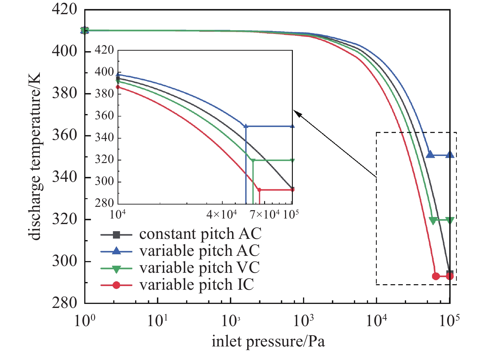 (1)理论计算发现,变螺距螺杆转子的入口压力越低,三种压缩形式的排气温度越接近;随着入口压力升高,排气温度均呈现先缓慢后迅速的下降趋势,直至发生过压缩工况后趋于稳定。绝热压缩达到过压缩的入口压力最低,排气温度最高,随后依次为多变压缩和等温压缩,过压缩后排气温度分别为350.7 K、319.8 K、293.2 K。等螺距螺杆真空泵的排气温度也随入口压力的升高呈现先缓慢后迅速的下降趋势。