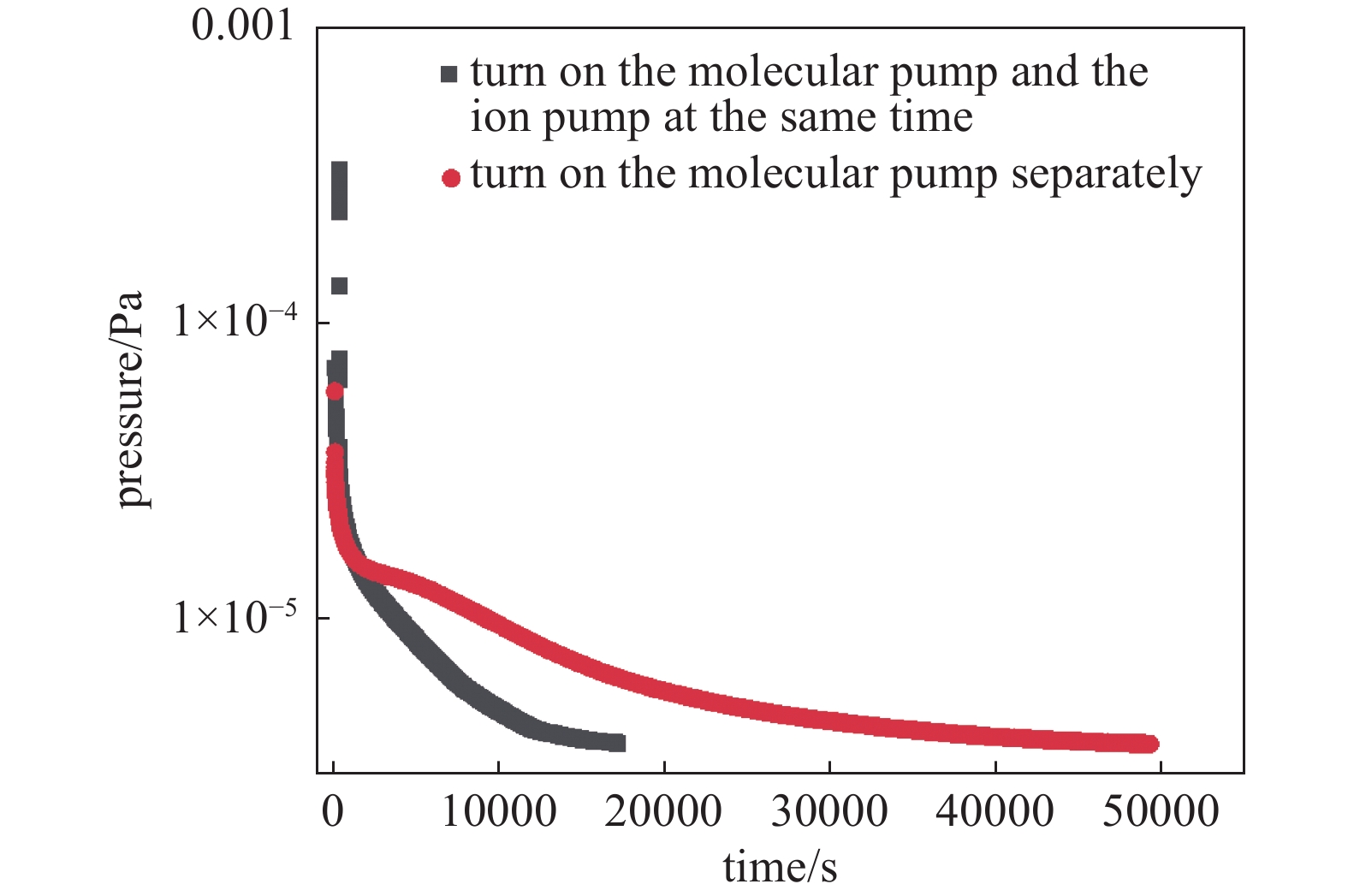 目前常用的真空系统在10−5−10−7 Pa量级通常使用分子泵与离子泵串联作为机组使用,分子泵作为主泵,离子泵作为辅助泵。因此,要测试离子泵作为辅助泵时的效果。将离子泵与分子泵机组串联进行抽气,结果如图9所示。