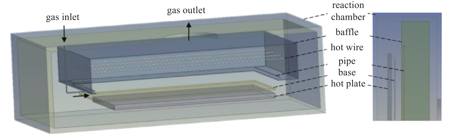 图1为HWCVD反应腔室的简化三维模型图,其工艺原理为:反应腔体内为低真空环境,其内有直流电加热的特种金属丝,加热丝的温度在控制系统作用下维持在一定温度(1700℃−2000℃),往腔内通入反应气体(SiH4、H2等),反应气体与高温金属丝碰撞,发生催化裂解,生成多种具有强烈活性的“不带电”的基团(Si、H、SixHy等),这些活性基团从热丝表面随机向四周发射,“落到”加热至200℃左右的硅片衬底上,并在衬底表面反应生成薄膜,沉积尾气通过出口真空泵抽离反应室。