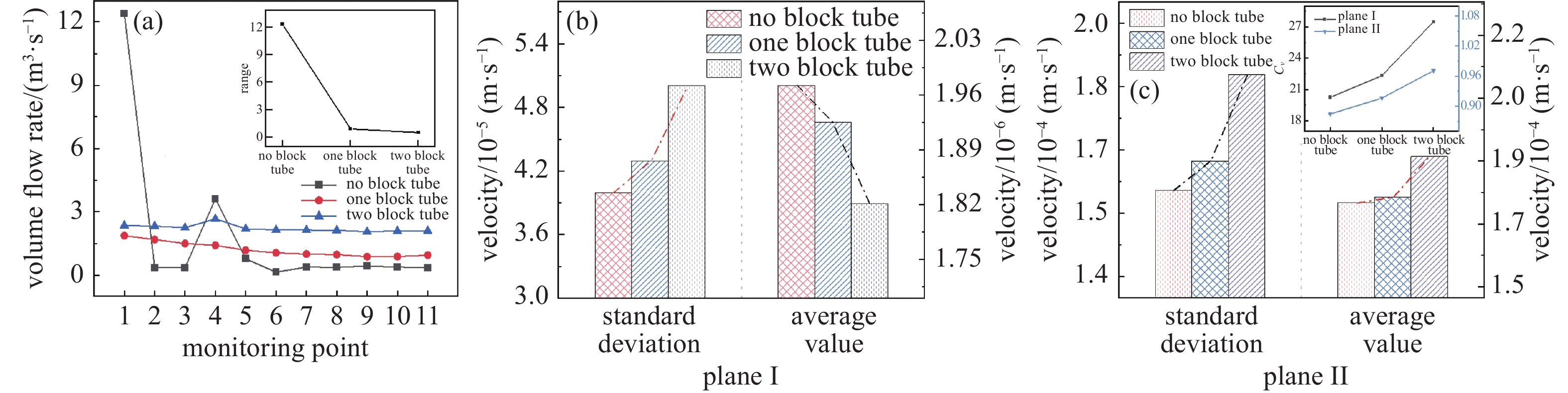 $ Cv $ 变化图Figure 10. Effect of the block tube on the gas flow velocity in cavity. (a) Gas flow variation chart at monitoring point, (b) velocity variation diagram of the plane Ⅰ, (c) velocity variation diagram of the plane Ⅱ and the
