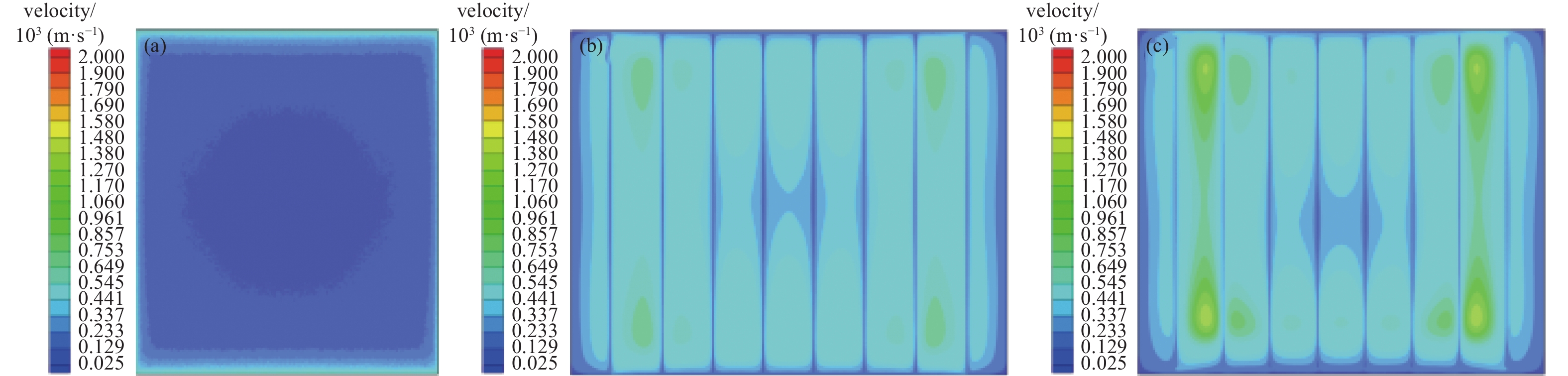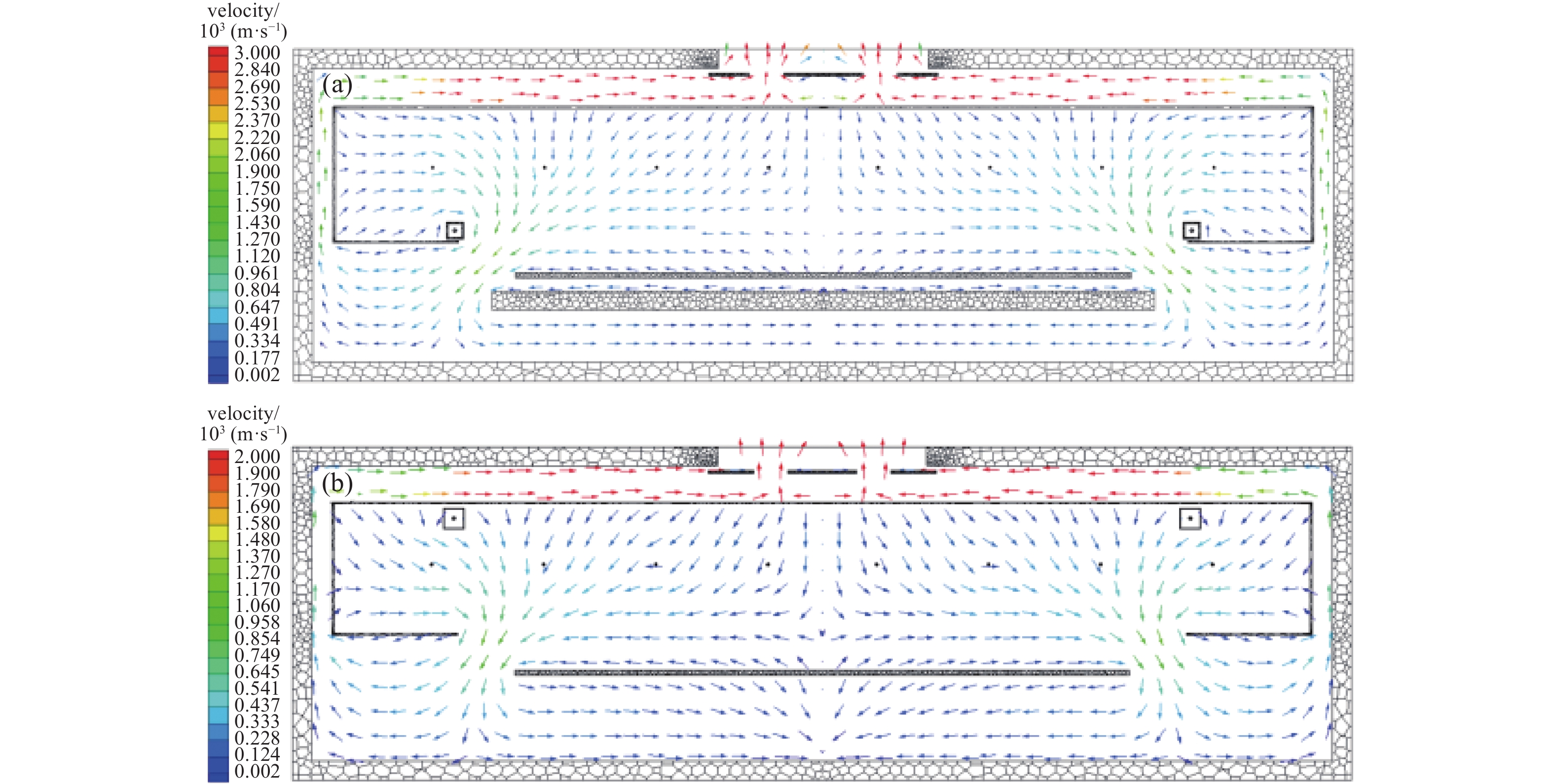 经计算增加一层挡管时能够有效控制进气管上进气孔流速均一性,在其他各优化参数固定基础上,调整进气管位置,按照进气管、热丝和基底的结构顺序进行沉积镀膜,为方便与传统结构区分定义该结构顺序为组合二。该组合方式下气流从进气管流出后直接通向热丝阵列附近,有利于提高源气体在热丝表面催化裂解的效率,增加气体利用率。图11(a),(b)分别为组合一与组合二在Y = −64 cm切面下速度矢量图,图示清晰显示了腔内气流运动方向及状态,气流在热丝附近裂解后流向基底表面,而后反应气体从防灼板与基底间隙流出,在防灼板区域两侧会形成一个回流区。组合一方式下进气管处于防灼板边缘,进气管体积对边缘气流存在阻碍作用,影响基底边缘气体流速。组合二方式下进气管靠近防灼板顶端,对腔内气流的阻碍明显减小,防灼板边缘气流运动通畅。图12(a)为组合二下基底上方平面Ⅰ速度云图,此时气流低速中心与基底中心一致,边缘流速高中心流速低。(b),(c)分别为组合二和组合一在热丝附近平面Ⅱ速度云图,由图显示在热辐射的作用下热丝阵列中心温度高导致气体密度低、流速低,热丝阵列边缘四角流速较其他区域高是因为四角靠近防灼板空间内四角,四角温度比热丝阵列附近温度低,在边缘气流回流的作用下导致热丝阵列四角流速高许多。同时组合Ⅱ下热丝阵列附近流速标准差降低,流速均匀性增强,热丝阵列边缘四角流速降低,中心流速升高,因气流从进气管流出后直接流向热丝附近。