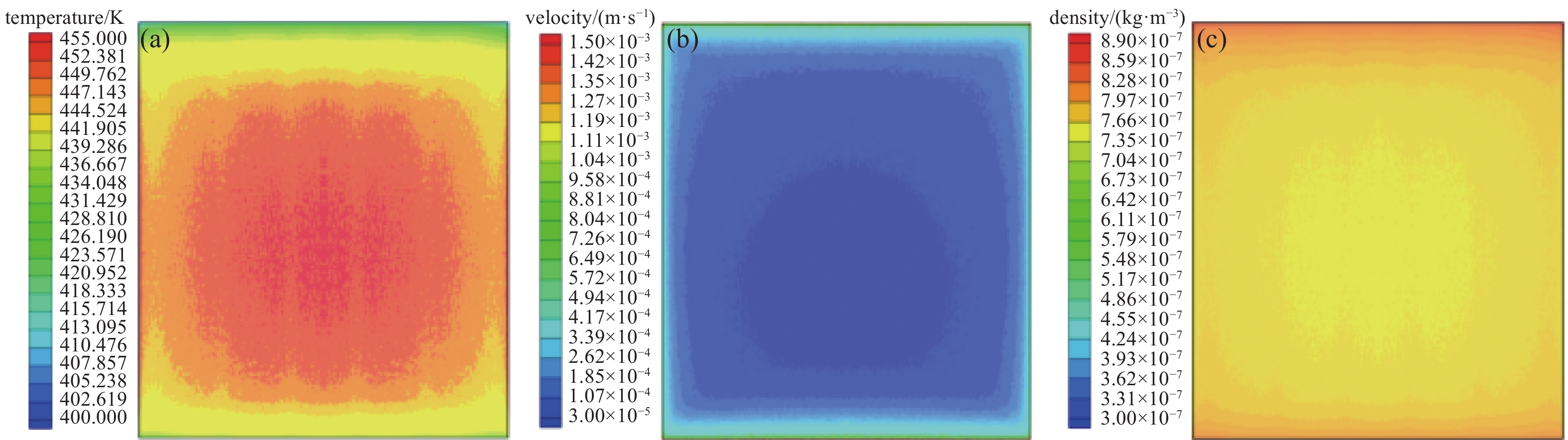 基底所在位置附近的热场和流场分布均匀性直接影响镀膜质量的高低,热丝作为腔内的高温热源为气源分解提供能量[21],其排布方式影响着腔内温度场的分布和气源分解后产生的基团及其能量,进而影响沉积薄膜质量。加热板作为辅助加热装置控制基底温度保持在合适镀膜温度范围内,促进基底表面反应基团的扩散和迁移。在常规工艺条件下,基底表面正上方2 mm平面处的温度、速度及密度分布云图如图2所示。分析不同工艺条件对区域内气体流速变化时,仅依靠数据平均值和标准差大小难以综合评定平面内气体流速均匀性好坏,因此引进数学统计中的变异系数作为评价基底附近气体流速均匀性的指标。记变异系数为