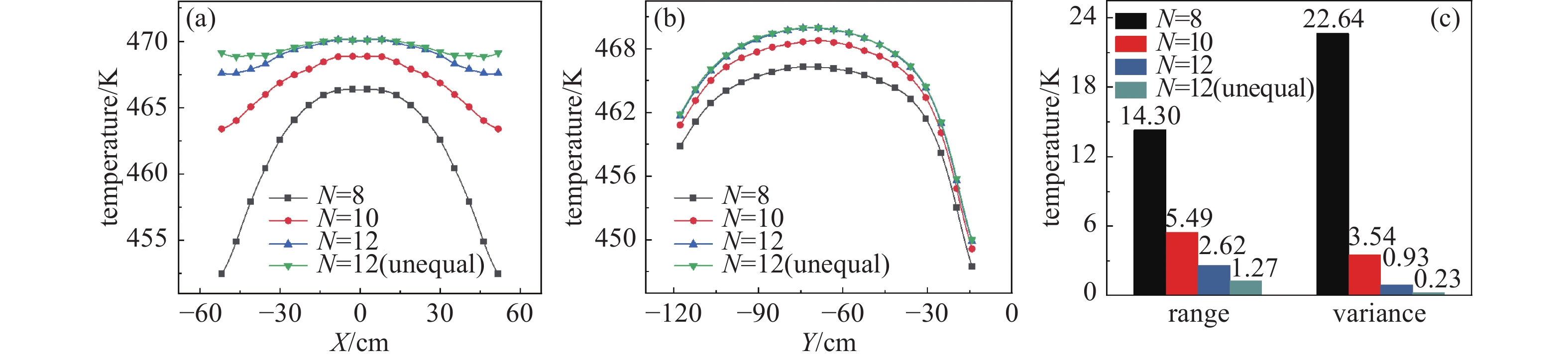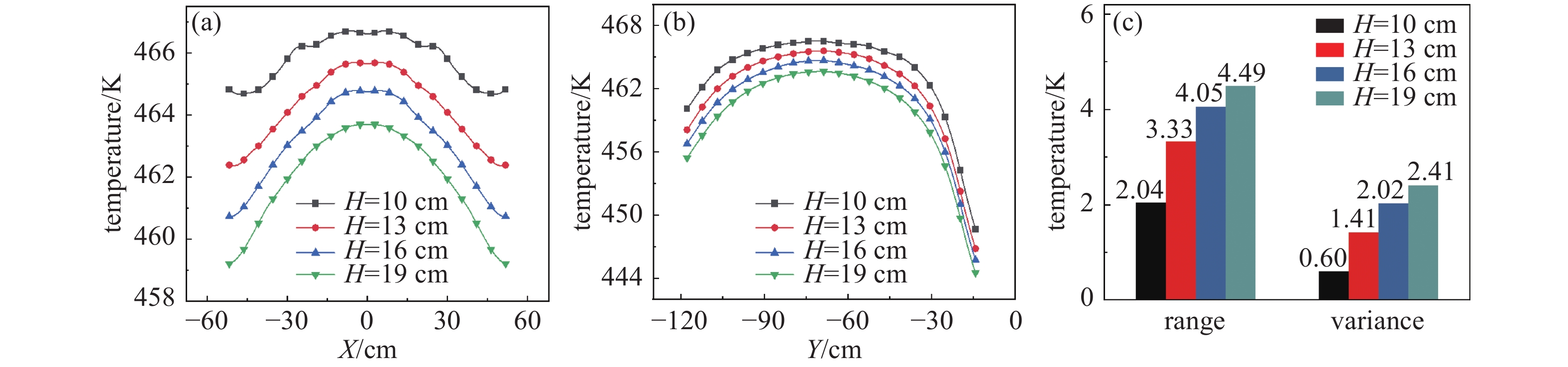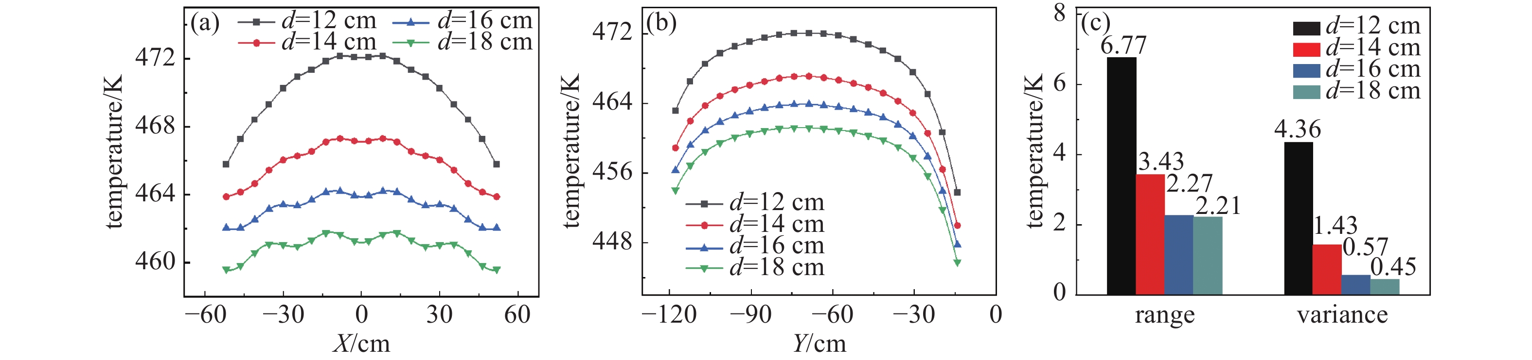 在热丝间距d = 14 cm,热丝距基底高度H = 13 cm时,探究热丝根数分别为N = 8,10,12,12(不等间距)下腔室内热流场分布。其中十二根热丝不等间距排布时,热丝阵列中间四根间距为14 cm,由中心向外热丝间距逐渐减少0.8 cm,至最外侧两热丝间距为11.6 cm。图3(a)为两监测直线中横向温度分布图,(b)为纵向温度分布图,(c)为横向温度极差、方差图。从图中可以发现,基底表面温度整体呈“中间高,四周低”的分布趋势,随着热丝数量的增加,基底表面温度逐渐升高,中心温度升高约4 k,且横向边缘温度升高较大,横向温差减小,温差由14.30 k降低至2.62 k。原因是生产中通入直流电以控制热丝加热,每根热丝温度固定,在低气压下以热丝为中心向四周产生热辐射,热丝等间距排布下热辐射均匀叠加形成由热丝阵列向腔内四周温度逐渐降低的温度场。每增加一根热丝使热丝阵列范围内温度升高,进而使基底表面温度升高。热丝阵列横向为热丝数量增加方向,纵向为热丝长度方向,因此热丝数量增加时,热丝阵列横向温度辐射范围增大,逐渐覆盖整个基底,导致监测面横向边缘温度明显升高,而纵向边缘温度波动较小,说明热丝阵列横向范围大于基底横向范围时有利于降低监测面横向温差。热丝不等间距排布与等间距排布对比发现,监测面横向边缘温度继续升高,纵向温度无变化,极差下降51.5%,方差下降75.3%。说明固定热丝数量时,降低热丝阵列边缘热丝间距能增加监测面边缘温度,增加基底温度均匀性。