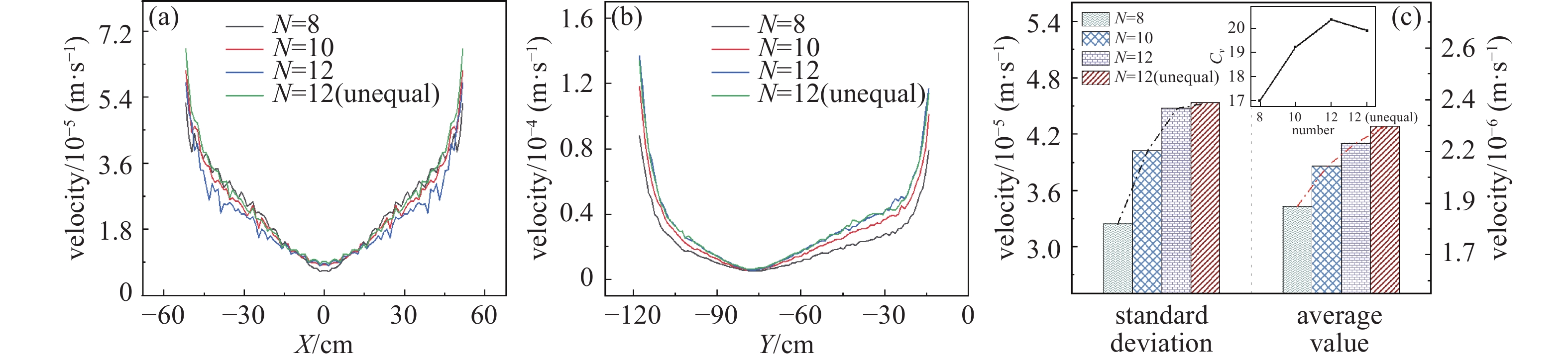 图4为不同热丝根数下速度分布图,其中(a),(b)分别为横向和纵向速度分布曲线,(c)为基底上方2 mm平面气体流速图。分析发现基底表面气体流速整体呈“中间低,四周高”的分布趋势,热丝数量的增加对基底中心小范围流速无明显影响,对中心至边缘部分有明显影响,且对边缘流速影响较大,横向流速逐渐降低,纵向流速逐渐升高。气体流速受温度分布影响显著,当温度升高时,气体分子的热运动加剧,导致气体密度相应降低,在相同压力下气体分子间的平均距离增大,从而减缓了整体的流动速度。随着热丝根数的增加,基底中心为热辐射中心,温度高且温度变化小,因此中心小范围内流速无明显变化。横向温度升高使流速降低,纵向气体流速受横向流速影响,气流向纵向挤压,导致流速增大,进而使平面流速标准差与流速均值均升高。热丝数量的增加明显改变了腔内温度场的分布,使基底表面气流均匀性降低。边缘热丝间距减小时横向温差减小,边缘流速增大,使变异系数降低,说明适当控制边缘热丝间距不仅能降低温差,还有利于增加气体流速均匀性。