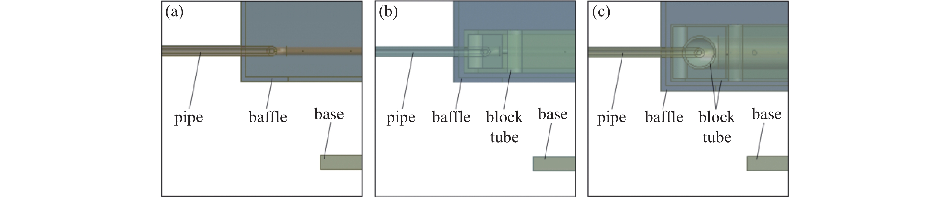 挡管结构如图9所示,图中(a),(b),(c)分别为无挡管、一层挡管和两层挡管,其中两层挡管时为减小管内气体流动阻力将第一层挡管设置为圆形管。弥散管及挡管上等间距均匀分布若干进气小孔,弥散管小孔直径D1 = 0.6 mm,间距L1 = 30 mm,挡管小孔直径D2 = 2 mm,间距L2 = 60 mm,小孔方向一致且均朝向腔体中心,同时各层小孔间错排列有利于起到气流缓冲作用。