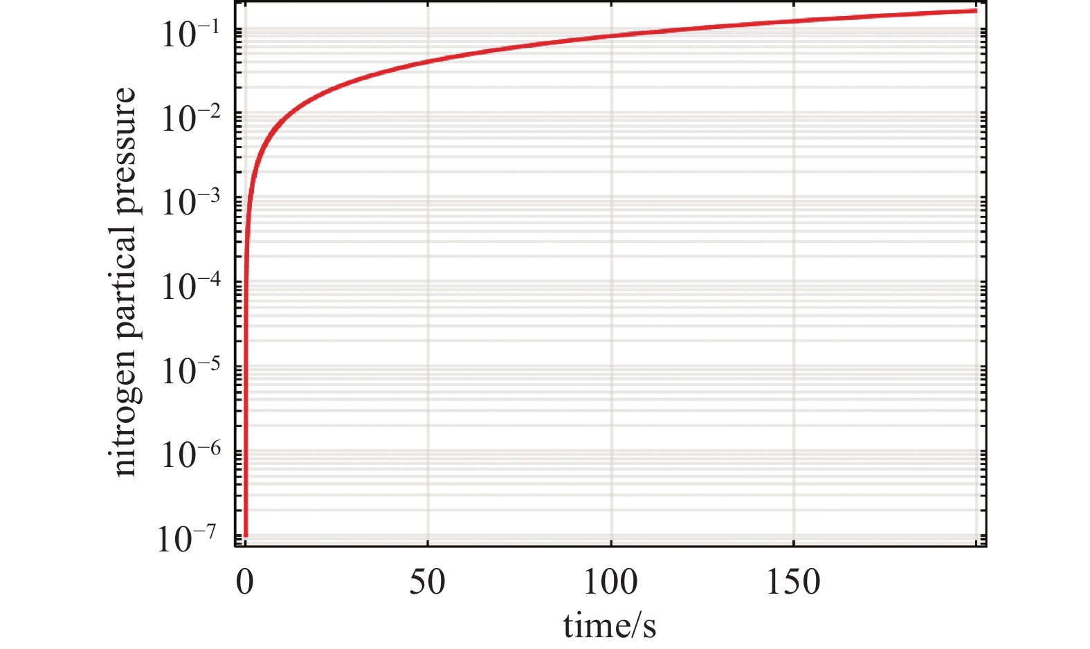 实验结果如图6所示,四极质谱仪 监测的水的分压在前330 s没有明显变化,从330 s开始出现明显上升信号,在约4 min时间内从 2.5×10−6 Pa 上升到 5.7×10−4 Pa。实验中观测到,伴随着水信号的快速上升,氮气信号也有了一定的上升,这是由水蒸气纯度不足所引起的。然后水分压趋于平稳,关闭阀门实验结束。