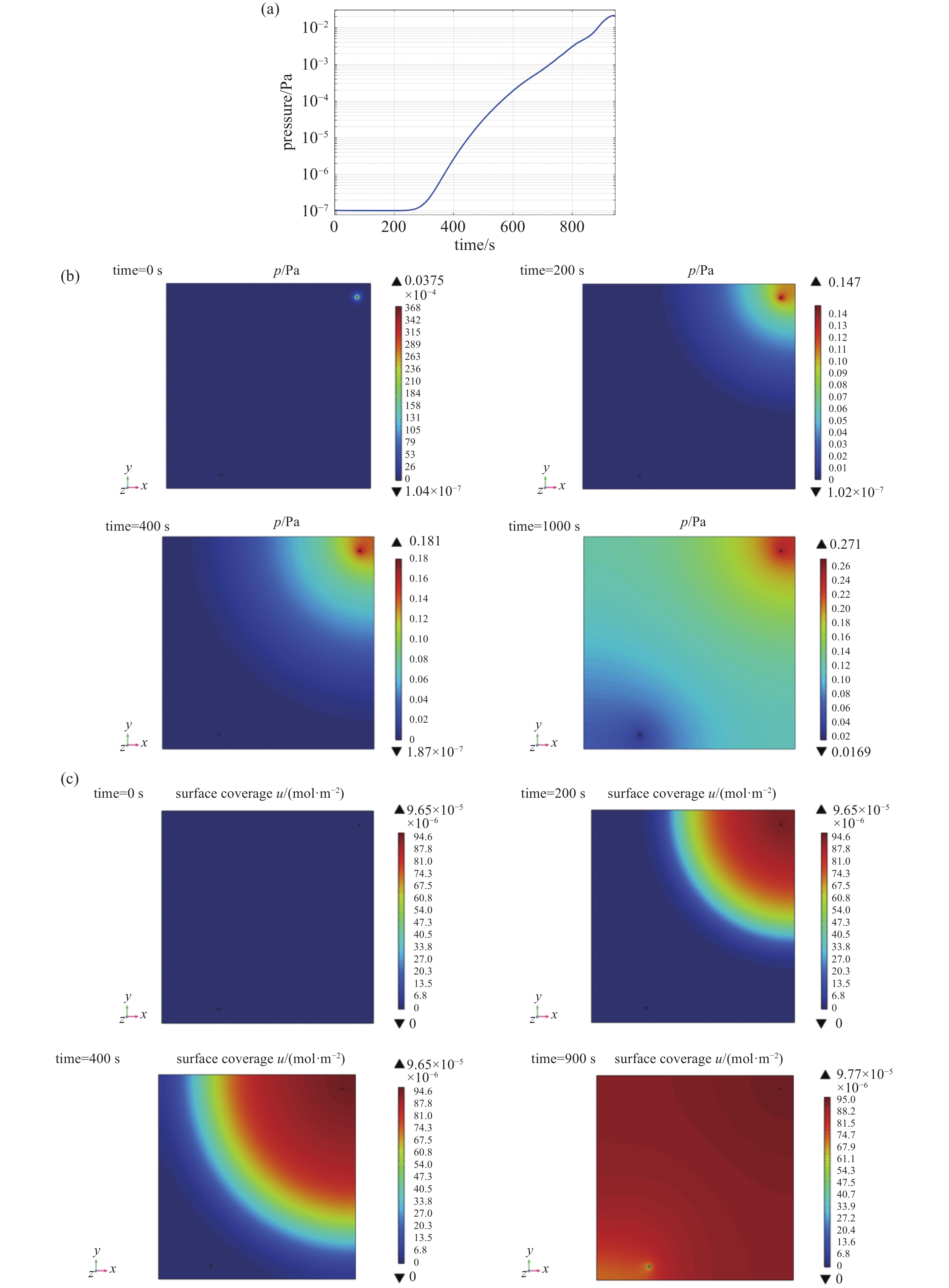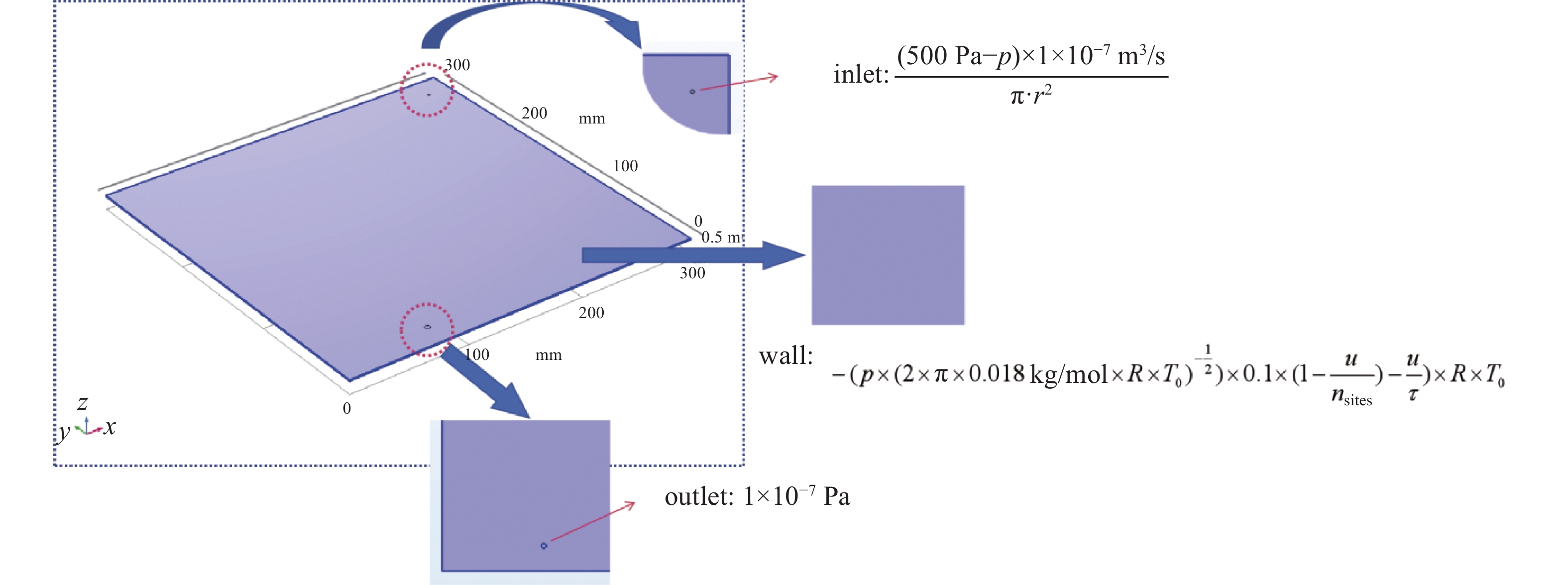 根据文献资料,水蒸气在常温下的解吸活化能(Ed)大约为20 kcal/mol[21-22],而氮气的解吸活化能则约为2.7−4.6 kcal/mol[23]。为了进行仿真,需要设定一系列边界条件,包括进气口的气体通量、分子泵抽气口的气体通量、初始的表面气体分子浓度、初始的狭缝空间压力,以及狭缝腔体表面上的吸附脱附通量。