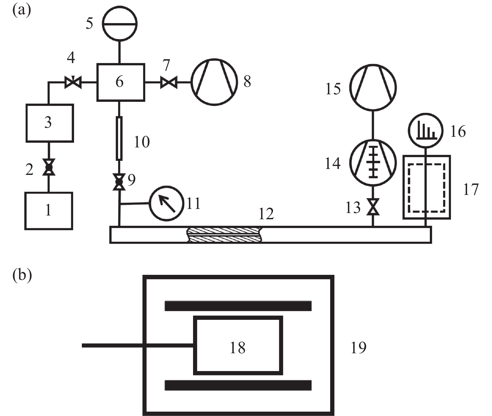实验流程包括氦气喷吹法检漏、真空环境下48 h 473 K烘烤除气,自然降温后经24 h抽气使系统本底稳定。气体制备中氮气通过干燥气瓶循环置换5−6次提纯,水蒸气由控温饱和蒸汽压装置产生,分别用于基础传输性能测试和含氢极性分子吸附−解吸迟滞效应研究。选择氮气(惰性分子)与水蒸气(极性分子)组合实验,可对比分析气体物化特性对狭缝输运机制的影响差异。测试时,对四极质谱仪前置延长管路进行373 K加热以避免水分子吸附与测试管路带来误差。