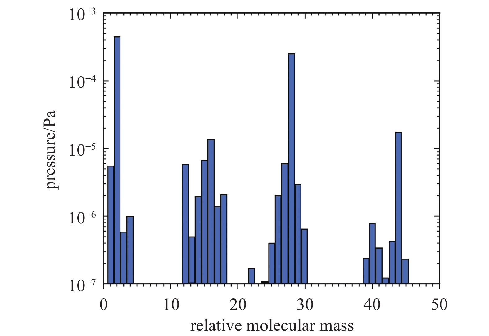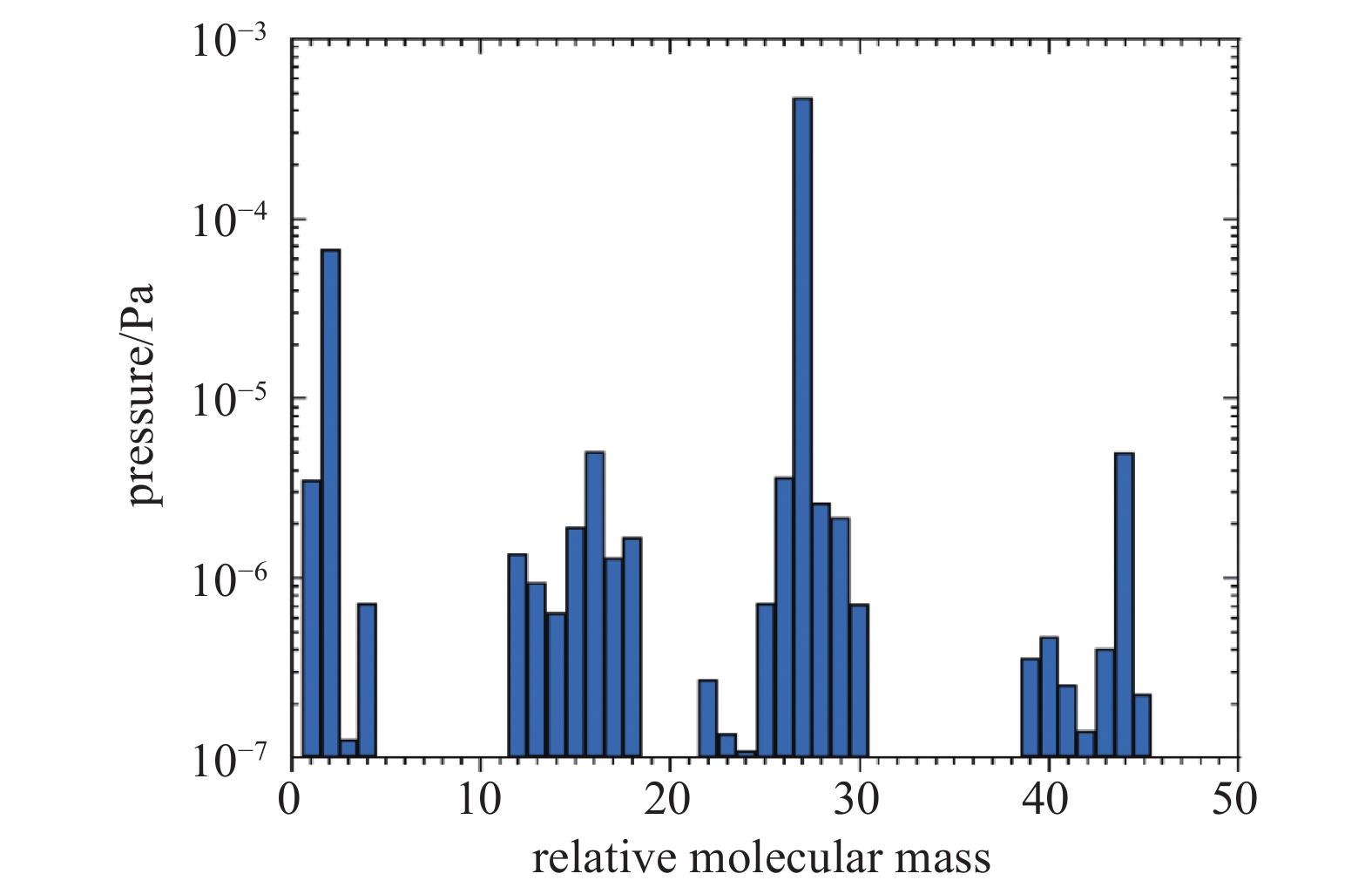 打开稳压室的机械泵和电容薄膜真空计,待稳定后关闭机械泵与稳压室间的阀门。缓慢打开充气室与稳压室之间的针阀1,使干燥氮气缓慢进入稳压室。当稳压室真空计示数达到需要的压力时,关闭针阀1,停止氮气充入。打开稳压室与狭缝间的球阀2,记录狭缝腔体上全量程真空计和四极质谱仪的数据变化,直至观察到明显的响应时间信号后关闭球阀2。实验前进行真空处理,烘烤后的本底如图3所示。测得此时总压力为9.8×10−4 Pa,水的分压为2.2×10−6 Pa,水分压占比仅为0.224%。