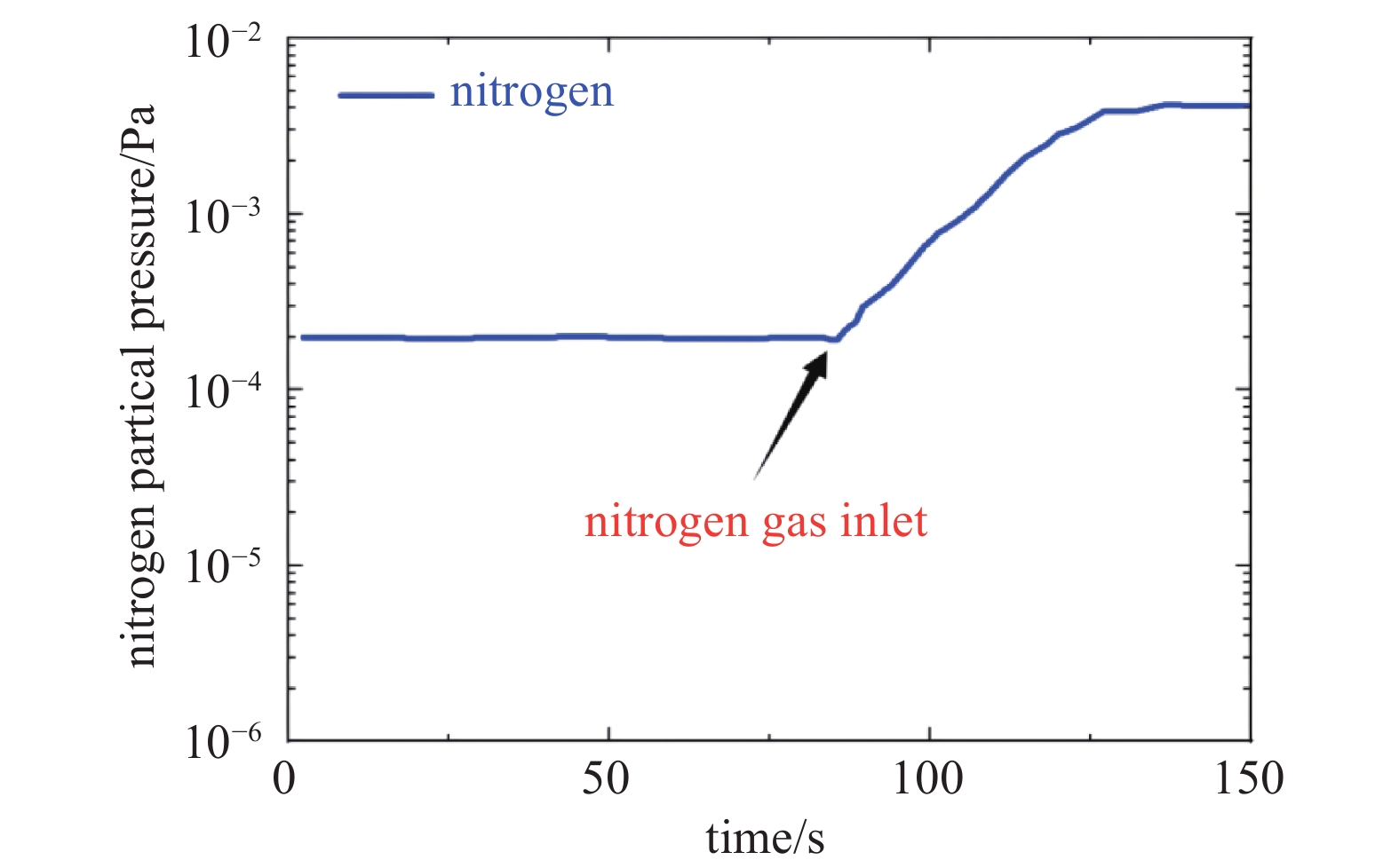 氮气的实验结果如图5所示,在第75 s开启球阀2,氮气的响应时间非常短,77 s开始远端全量程真空计示数在1 min内由9.8×10−4 Pa升高到5.8×10−3 Pa,质谱显示的氮气分压迅速上升,在1 min内从5×10−4 Pa升高到4×10−3 Pa。之后氮气分压趋于平稳,遂关闭进气阀门,氮气被分子泵迅速抽走,氮气分压降低。